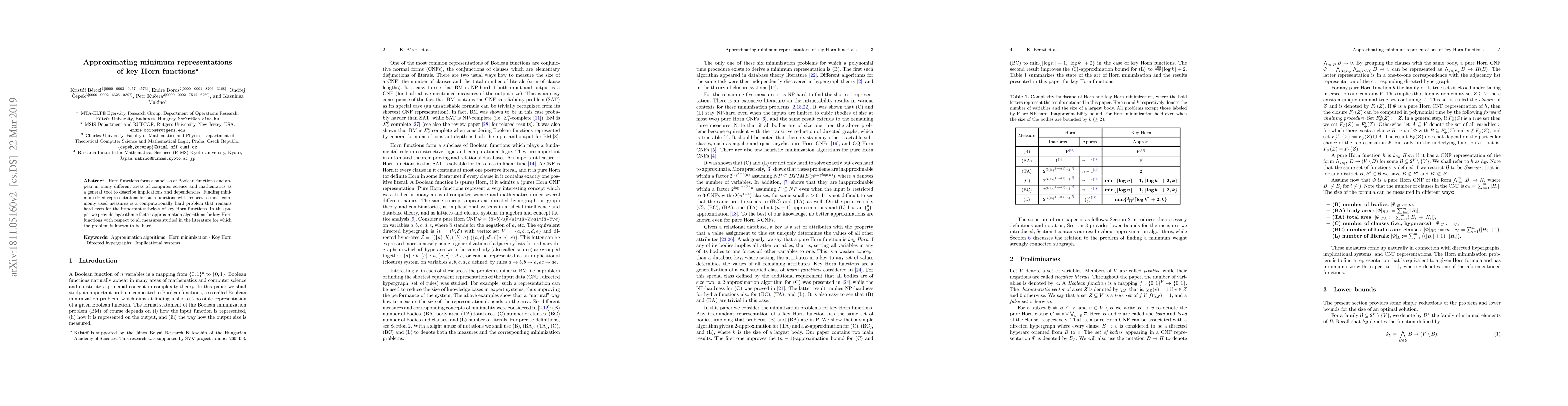 This paper presents logarithmic factor approximation algorithms for finding minimum sized representations of key Horn functions, addressing a computationally challenging problem that remains difficult even for this important subclass. The algorithms apply to all known hard measures in the literature.