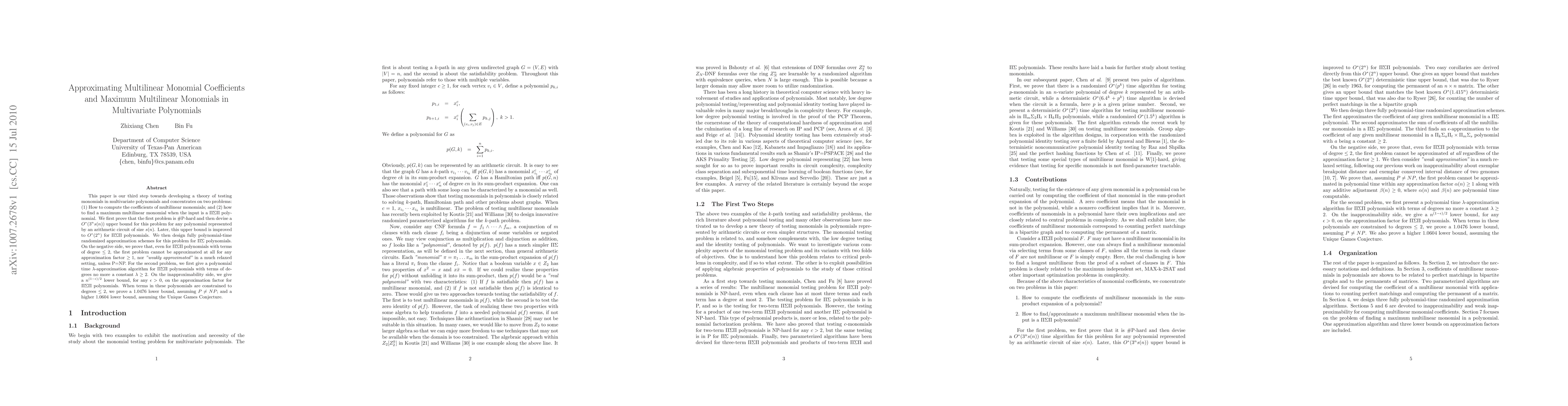 This paper investigates approximating coefficients of multilinear monomials in multivariate polynomials and finding maximum multilinear monomials with polynomial-time randomized approximation schemes, while proving lower bounds on approximation factors for certain cases.