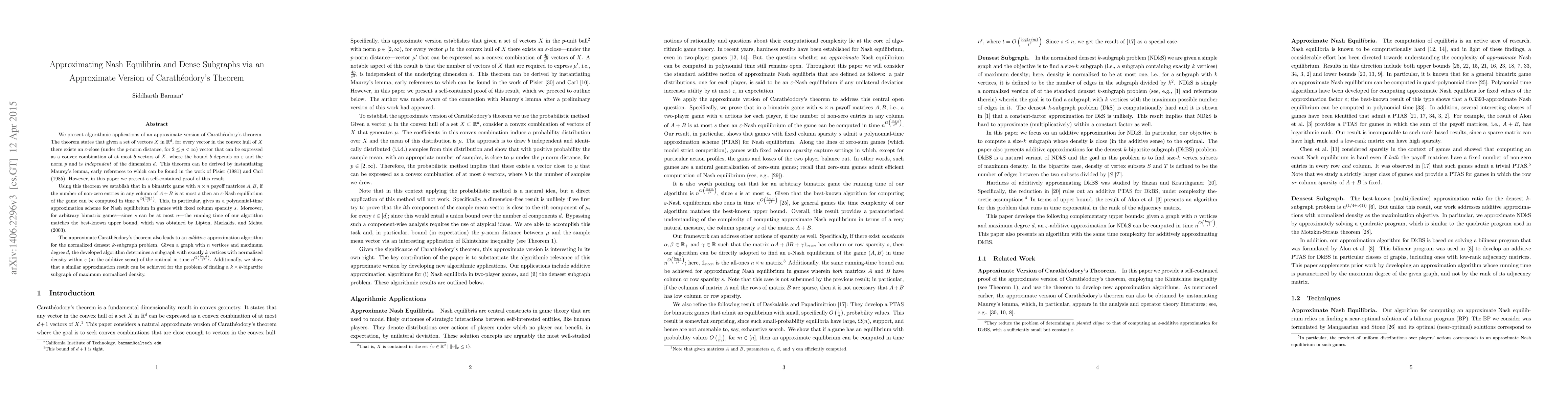 We present algorithmic applications of an approximate version of Carath\'{e}odory's theorem. The theorem states that given a set of vectors $X$ in $\mathbb{R}^d$, for every vector in the convex hull of $X$ there exists an $\varepsilon$-close (under the $p$-norm distance, for $2\leq p < \infty$) vector that can be expressed as a convex combination of at most $b$ vectors of $X$, where the bound $b$ depends on $\varepsilon$ and the norm $p$ and is independent of the dimension $d$. This theorem can be derived by instantiating Maurey's lemma, early references to which can be found in the work of Pisier (1981) and Carl (1985). However, in this paper we present a self-contained proof of this result. Using this theorem we establish that in a bimatrix game with $ n \times n$ payoff matrices $A, B$, if the number of non-zero entries in any column of $A+B$ is at most $s$ then an $\varepsilon$-Nash equilibrium of the game can be computed in time $n^{O\left(\frac{\log s }{\varepsilon^2}\right)}$. This, in particular, gives us a polynomial-time approximation scheme for Nash equilibrium in games with fixed column sparsity $s$. Moreover, for arbitrary bimatrix games---since $s$ can be at most $n$---the running time of our algorithm matches the best-known upper bound, which was obtained by Lipton, Markakis, and Mehta (2003). The approximate Carath\'{e}odory's theorem also leads to an additive approximation algorithm for the normalized densest $k$-subgraph problem. Given a graph with $n$ vertices and maximum degree $d$, the developed algorithm determines a subgraph with exactly $k$ vertices with normalized density within $\varepsilon$ (in the additive sense) of the optimal in time $n^{O\left( \frac{\log d}{\varepsilon^2}\right)}$. Additionally, we show that a similar approximation result can be achieved for the problem of finding a $k \times k$-bipartite subgraph of maximum normalized density.