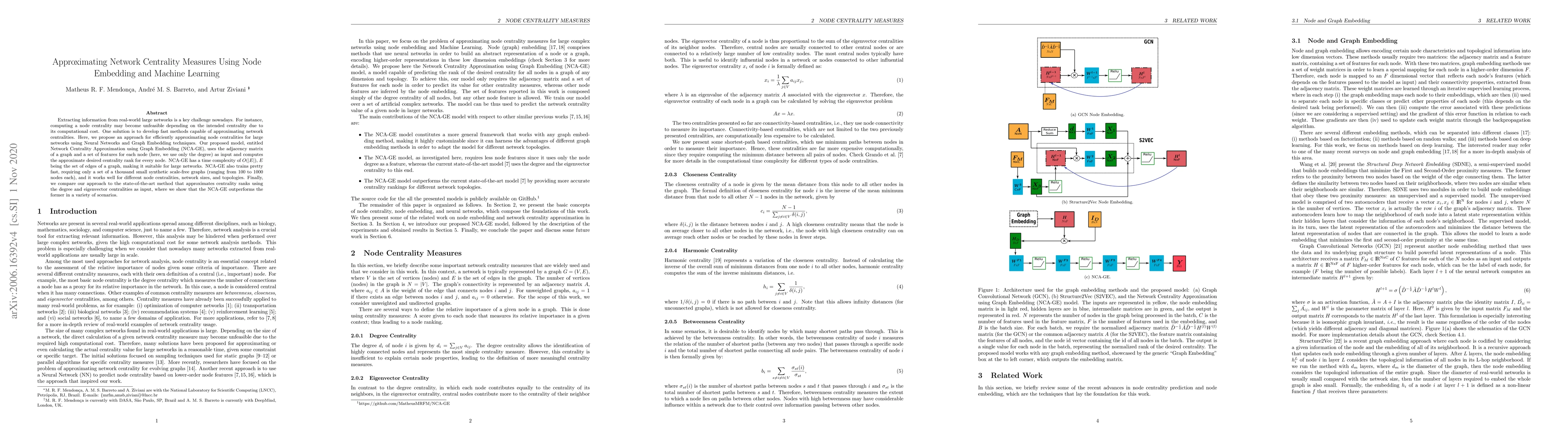 This paper proposes NCA-GE, a method for efficiently approximating node centrality in large networks using Neural Networks and Graph Embedding techniques. It demonstrates superior performance compared to state-of-the-art methods, with a time complexity of $O(|E|)$ and effective training on synthetic scale-free graphs.