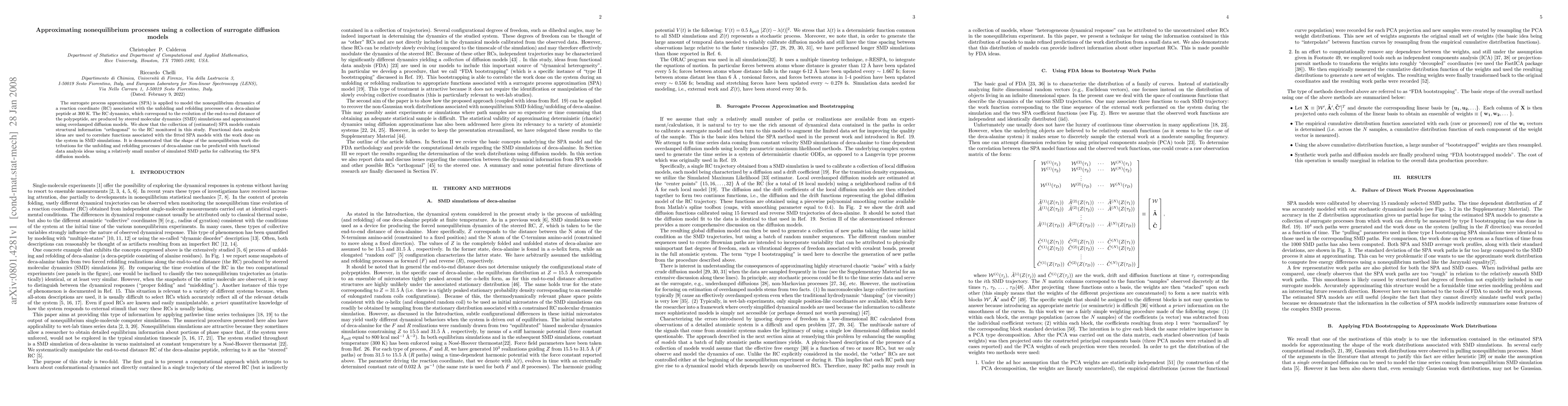 The surrogate process approximation (SPA) is applied to model the nonequilibrium dynamics of a reaction coordinate (RC) associated with the unfolding and refolding processes of a deca-alanine peptide at 300 K. The RC dynamics, which correspond to the evolution of the end-to-end distance of the polypeptide, are produced by steered molecular dynamics (SMD) simulations and approximated using overdamped diffusion models. We show that the collection of (estimated) SPA models contain structural information "orthogonal" to the RC monitored in this study. Functional data analysis ideas are used to correlate functions associated with the fitted SPA models with the work done on the system in SMD simulations. It is demonstrated that the shape of the nonequilibrium work distributions for the unfolding and refolding processes of deca-alanine can be predicted with functional data analysis ideas using a relatively small number of simulated SMD paths for calibrating the SPA diffusion models.