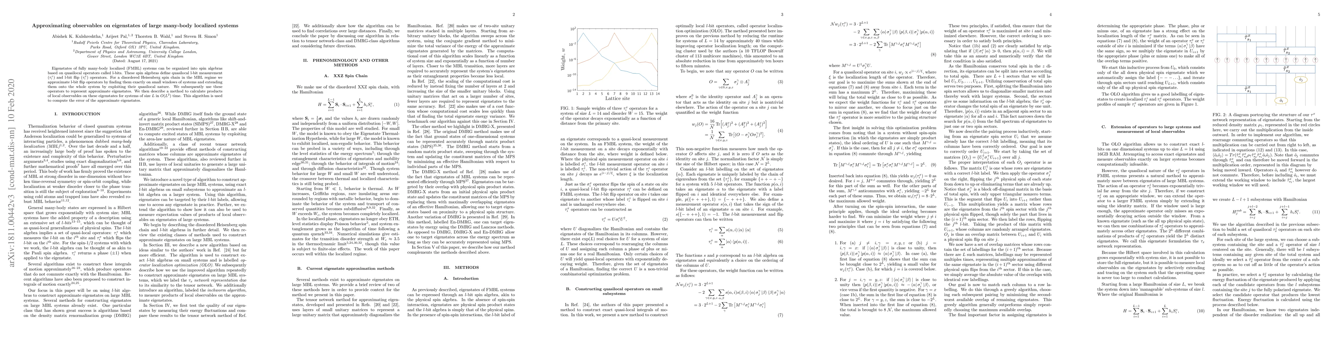 Eigenstates of fully many-body localized (FMBL) systems can be organized into spin algebras based on quasilocal operators called l-bits. These spin algebras define quasilocal l-bit measurement ($\tau^z_i$) and l-bit flip ($\tau^x_i$) operators. For a disordered Heisenberg spin chain in the MBL regime we approximate l-bit flip operators by finding them exactly on small windows of systems and extending them onto the whole system by exploiting their quasilocal nature. We subsequently use these operators to represent approximate eigenstates. We then describe a method to calculate products of local observables on these eigenstates for systems of size $L$ in $O(L^2)$ time. This algorithm is used to compute the error of the approximate eigenstates.