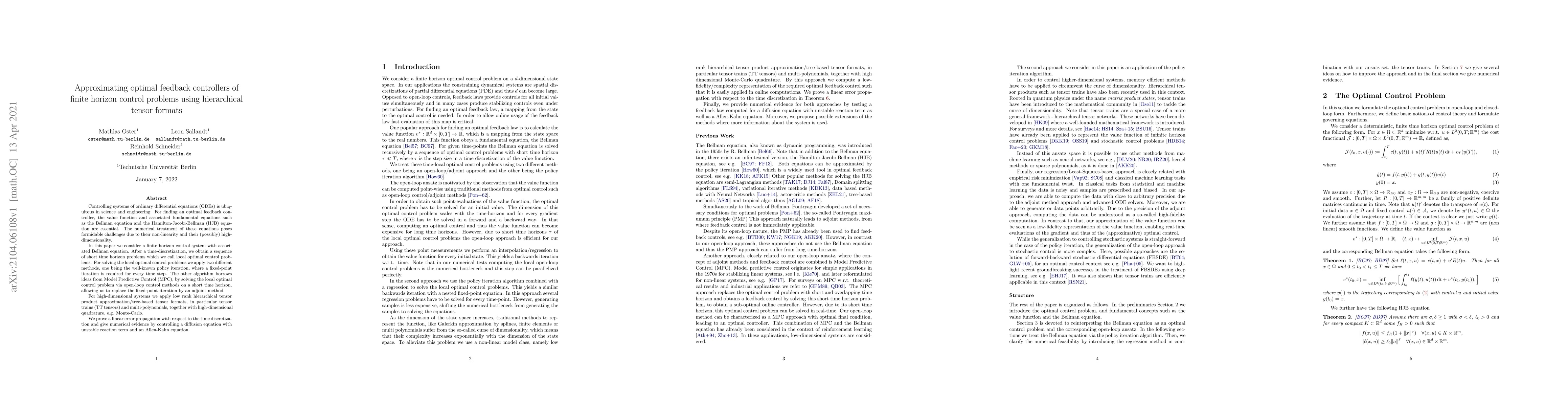 This paper proposes methods to approximate optimal feedback controllers for finite horizon control problems using hierarchical tensor formats. The authors apply policy iteration and Model Predictive Control techniques, supplemented by tensor train approximations and high-dimensional quadrature for high-dimensional systems, demonstrating effectiveness through examples involving diffusion and Allen-Cahn equations.