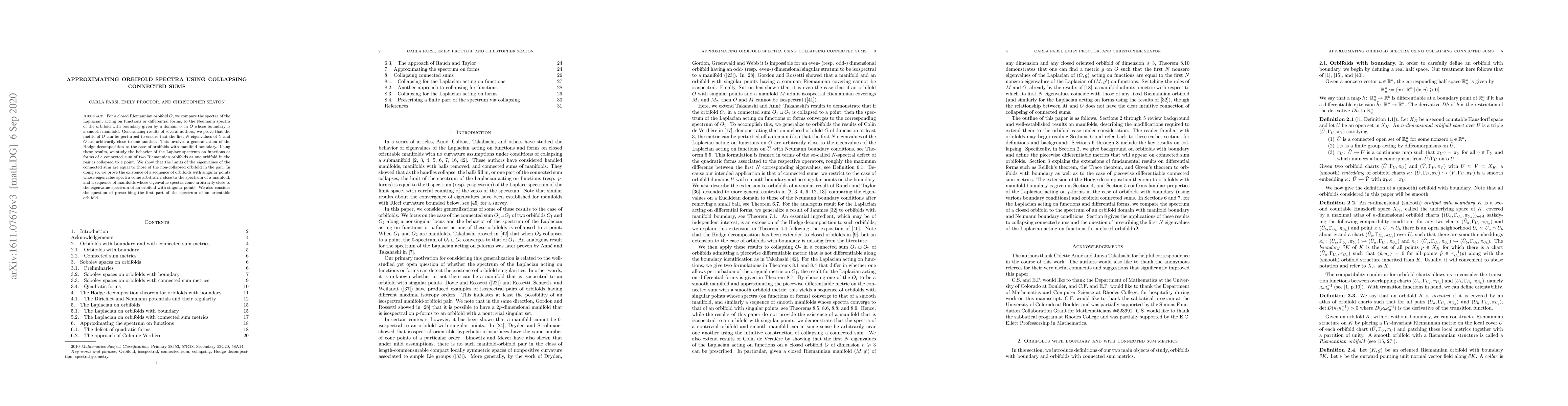 For a closed Riemannian orbifold $O$, we compare the spectra of the Laplacian, acting on functions or differential forms, to the Neumann spectra of the orbifold with boundary given by a domain $U$ in $O$ whose boundary is a smooth manifold. Generalizing results of several authors, we prove that the metric of $O$ can be perturbed to ensure that the first $N$ eigenvalues of $U$ and $O$ are arbitrarily close to one another. This involves a generalization of the Hodge decomposition to the case of orbifolds with manifold boundary. Using these results, we study the behavior of the Laplace spectrum on functions or forms of a connected sum of two Riemannian orbifolds as one orbifold in the pair is collapsed to a point. We show that the limits of the eigenvalues of the connected sum are equal to those of the non-collapsed orbifold in the pair. In doing so, we prove the existence of a sequence of orbifolds with singular points whose eigenvalue spectra come arbitrarily close to the spectrum of a manifold, and a sequence of manifolds whose eigenvalue spectra come arbitrarily close to the eigenvalue spectrum of an orbifold with singular points. We also consider the question of prescribing the first part of the spectrum of an orientable orbifold.