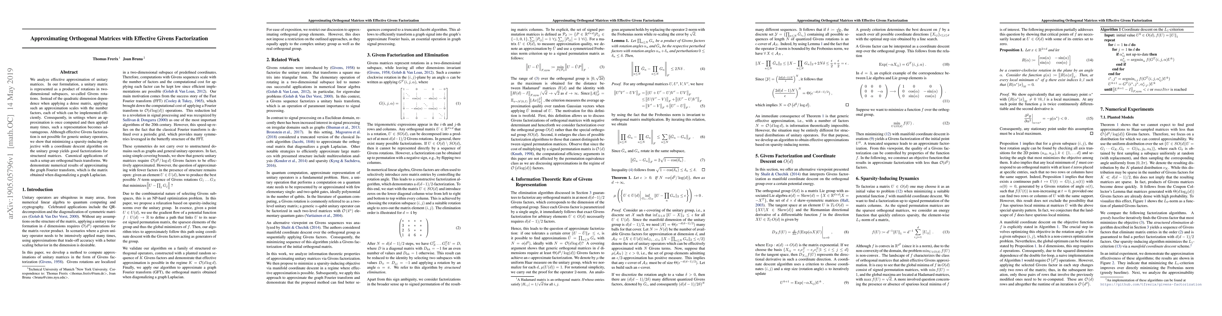 We analyze effective approximation of unitary matrices. In our formulation, a unitary matrix is represented as a product of rotations in two-dimensional subspaces, so-called Givens rotations. Instead of the quadratic dimension dependence when applying a dense matrix, applying such an approximation scales with the number factors, each of which can be implemented efficiently. Consequently, in settings where an approximation is once computed and then applied many times, such a representation becomes advantageous. Although effective Givens factorization is not possible for generic unitary operators, we show that minimizing a sparsity-inducing objective with a coordinate descent algorithm on the unitary group yields good factorizations for structured matrices. Canonical applications of such a setup are orthogonal basis transforms. We demonstrate numerical results of approximating the graph Fourier transform, which is the matrix obtained when diagonalizing a graph Laplacian.