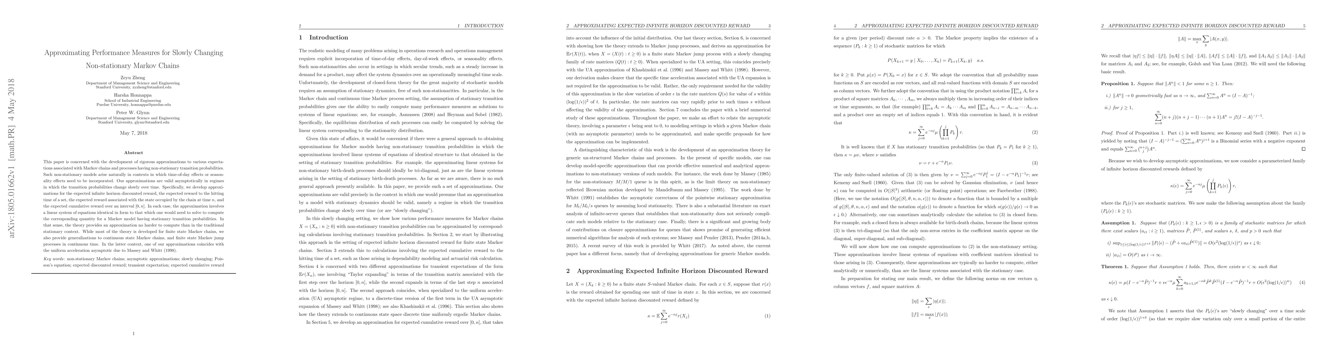 This paper develops approximations for various performance measures of non-stationary Markov chains with slowly changing transition probabilities, providing linear systems similar to those used for stationary models. The approximations cover expected rewards over different time horizons and generalize to continuous state Markov chains and jump processes.