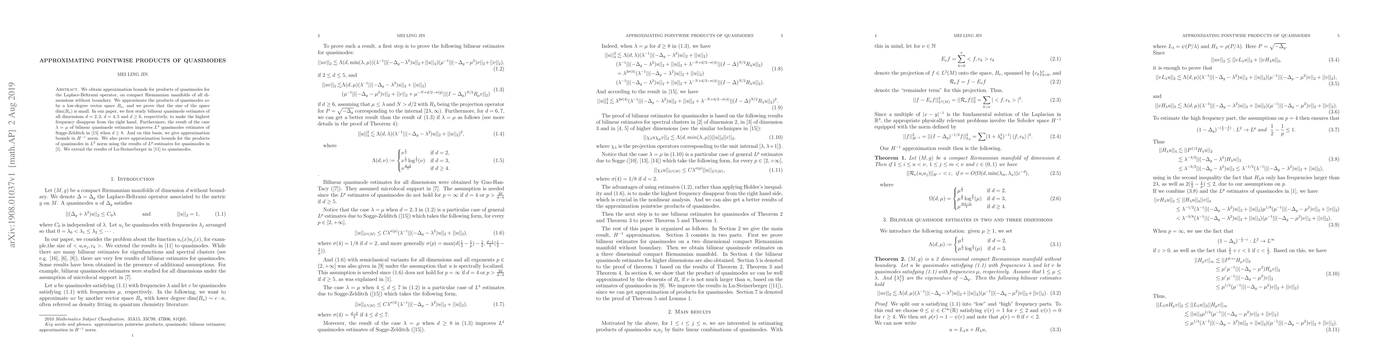 We obtain approximation bounds for products of quasimodes for the Laplace-Beltrami operator, on compact Riemannian manifolds of all dimensions without boundary. We approximate the products of quasimodes $uv$ by a low-degree vector space $B_{n}$, and we prove that the size of the space $\dim(B_{n})$ is small. In our paper, we first study bilinear quasimode estimates of all dimensions $d = 2, 3$, $d = 4,5$ and $d \ge 6$, respectively, to make the highest frequency disappear from the right hand. Furthermore, the result of the case $\lambda=\mu$ of bilinear quasimode estimates improves $L^{4}$ quasimodes estimates of Sogge-Zelditch in \cite{sogge6} when $d \ge 8$. And on this basis, we give approximation bounds in $H^{-1}$ norm. We also prove approximation bounds for the products of quasimodes in $L^{2}$ norm using the results of $L^{p}$-estimates for quasimodes in \cite{sogge3}. We extend the results of Lu-Steinerberger in \cite{lu} to quasimodes.