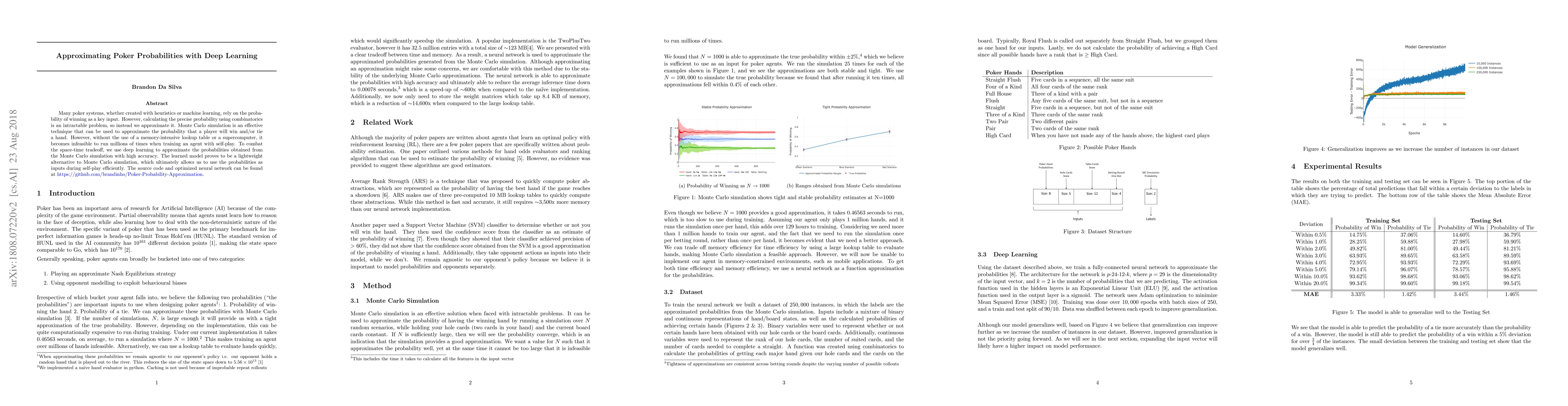 This paper proposes using deep learning to approximate poker hand win probabilities, addressing the computational infeasibility of Monte Carlo simulations for training poker agents. The deep learning model provides a lightweight alternative, enabling efficient use of these probabilities during self-play.
