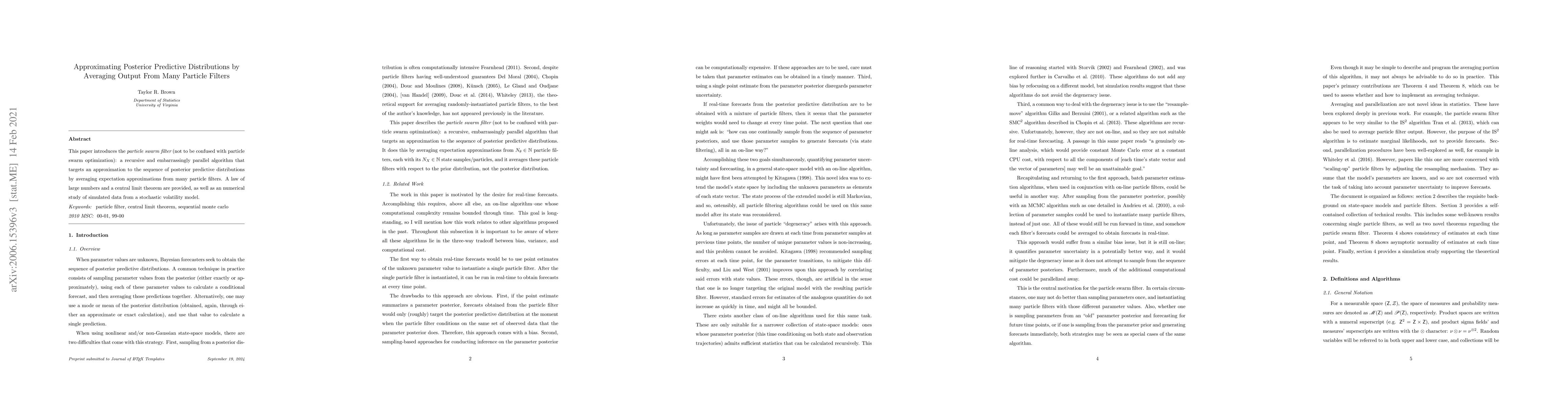 This paper proposes a particle swarm filter, a parallel algorithm that approximates posterior predictive distributions by averaging outputs from multiple particle filters, supported by a law of large numbers and a central limit theorem, and validated through simulations on a stochastic volatility model.