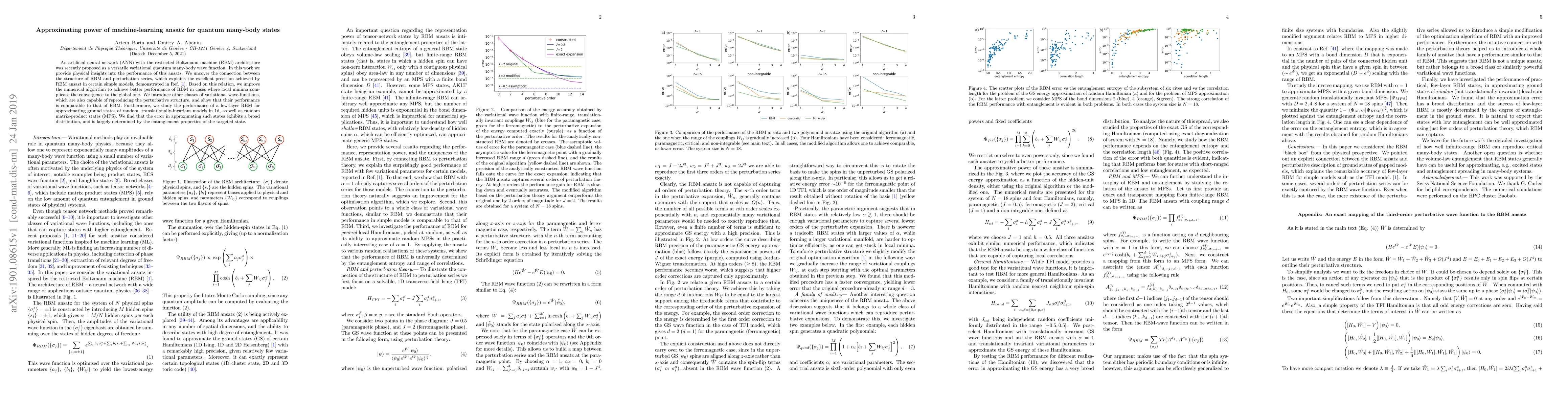 This paper investigates the performance of restricted Boltzmann machine (RBM) ansatz in approximating quantum many-body states, revealing its connection to perturbation series and improving its numerical algorithm for better convergence. It also explores other variational wave-functions and finds that their performance is comparable to RBM, while analyzing the entanglement-dependent error in approximating random states.