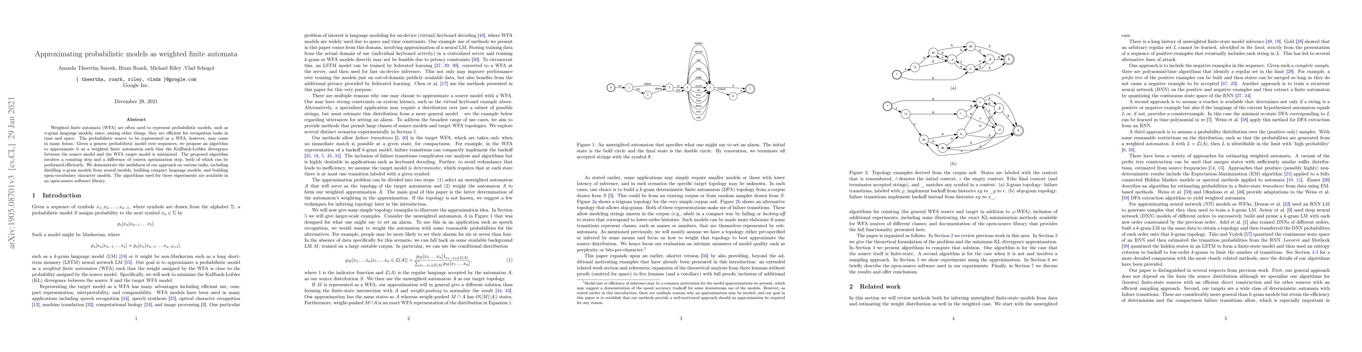 The paper proposes an algorithm to approximate complex probabilistic models as weighted finite automata (WFA) by minimizing the Kullback-Leibler divergence, demonstrating its effectiveness in tasks like distilling $n$-gram models and building compact language models. The algorithm is efficiently implemented and made available in an open-source library.