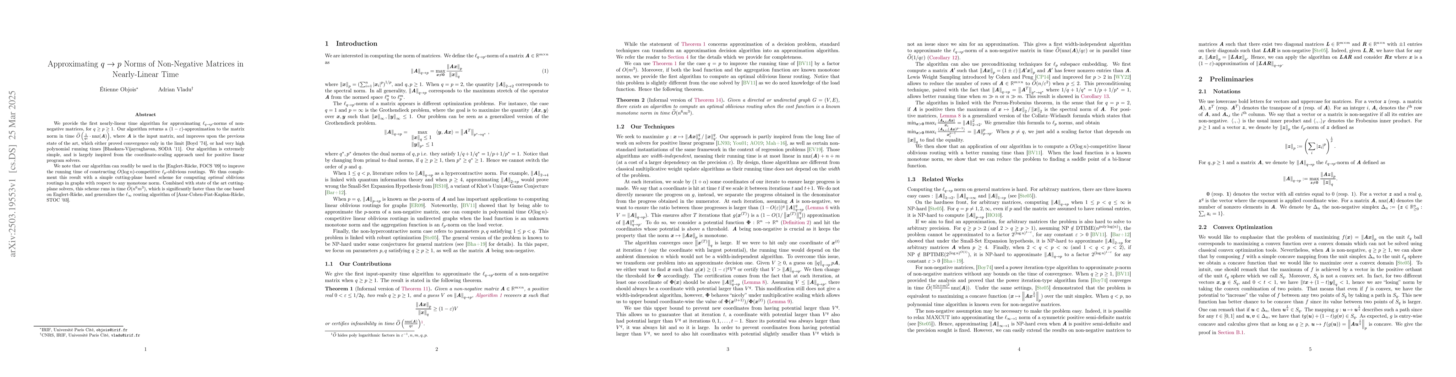 The paper presents an algorithm for approximating $\ell_{q \rightarrow p}$-norms of non-negative matrices in nearly-linear time, inspired by coordinate-scaling approaches used for positive linear program solvers.