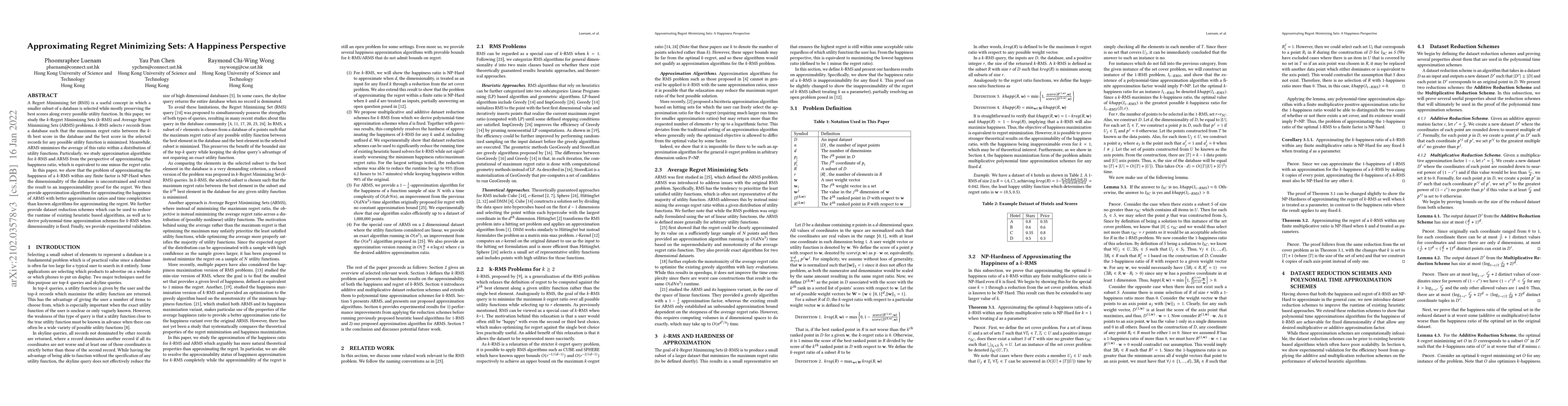 This paper investigates approximation algorithms for $k$-Regret Minimizing Sets ($k$-RMS) and Average Regret Minimizing Sets (ARMS), focusing on minimizing the regret ratio to maximize "happiness" in selected subsets. It proves the NP-hardness of approximating happiness within any finite factor and provides better approximation algorithms for ARMS with improved ratios and complexities.