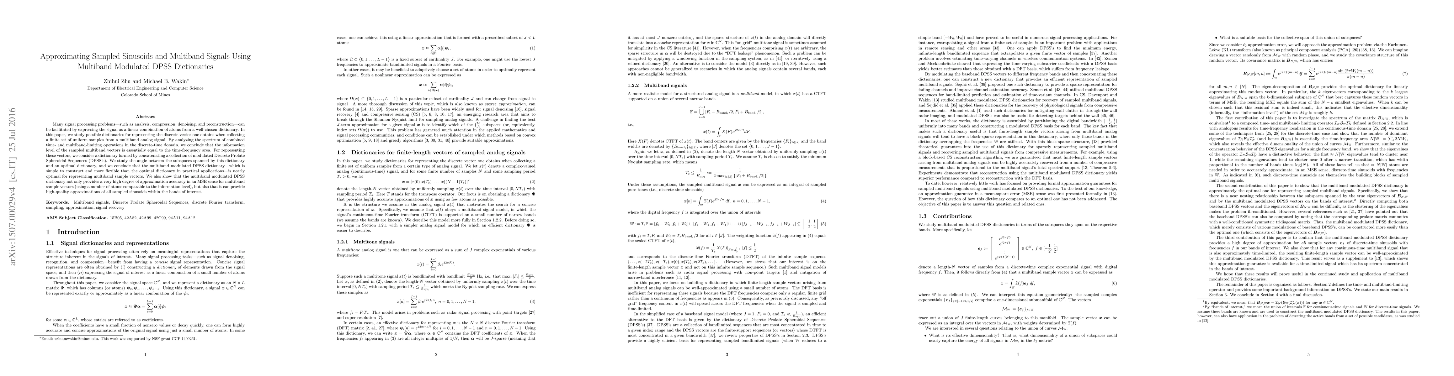 This paper proposes using a multiband modulated Discrete Prolate Spheroidal Sequences (DPSS) dictionary to represent sampled multiband signals, demonstrating its near-optimality and high approximation accuracy compared to an optimal dictionary. The method is shown to effectively approximate both multiband signals and sampled sinusoids within specified frequency bands.