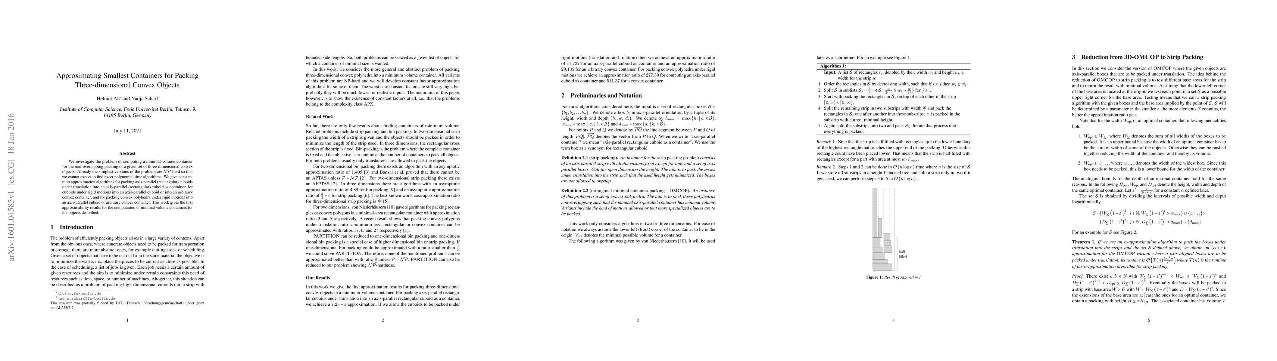This paper presents constant ratio approximation algorithms for computing minimal volume containers to pack three-dimensional convex objects, including axis-parallel cuboids and convex polyhedra, under various constraints. It addresses the inherent NP-hardness of the problem by providing the first approximability results for these packing scenarios.