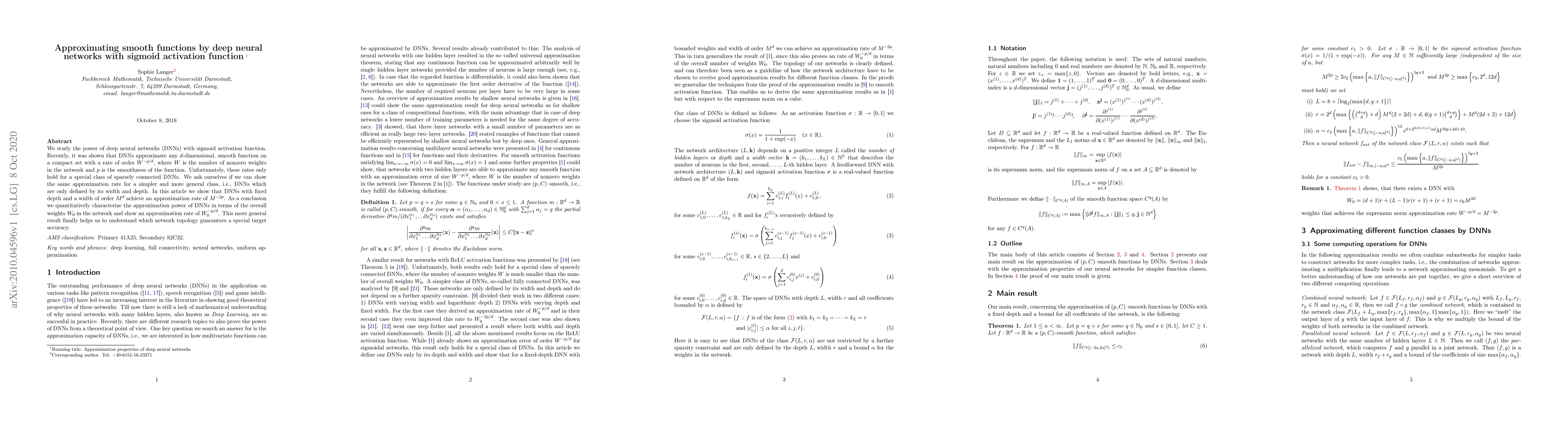 This paper investigates the approximation capabilities of deep neural networks (DNNs) with sigmoid activation functions, demonstrating that DNNs with fixed depth and width of order $M^d$ can approximate smooth functions with an approximation rate of $M^{-2p}$. This generalizes previous results to a broader class of DNNs beyond sparse connections.