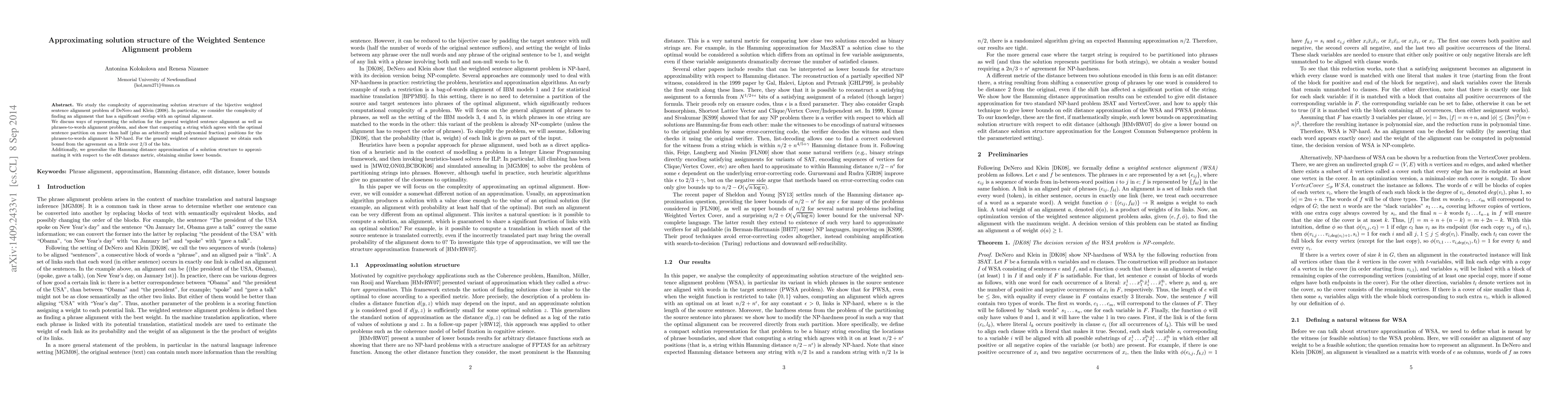 The paper adapts the framework of Hamilton et al. (2007) and techniques from Sheldon and Young (2013) to study the complexity of approximating solution structures for the weighted sentence alignment (WSA) problem and its phrase-to-word variant, focusing on Hamming and edit distances.