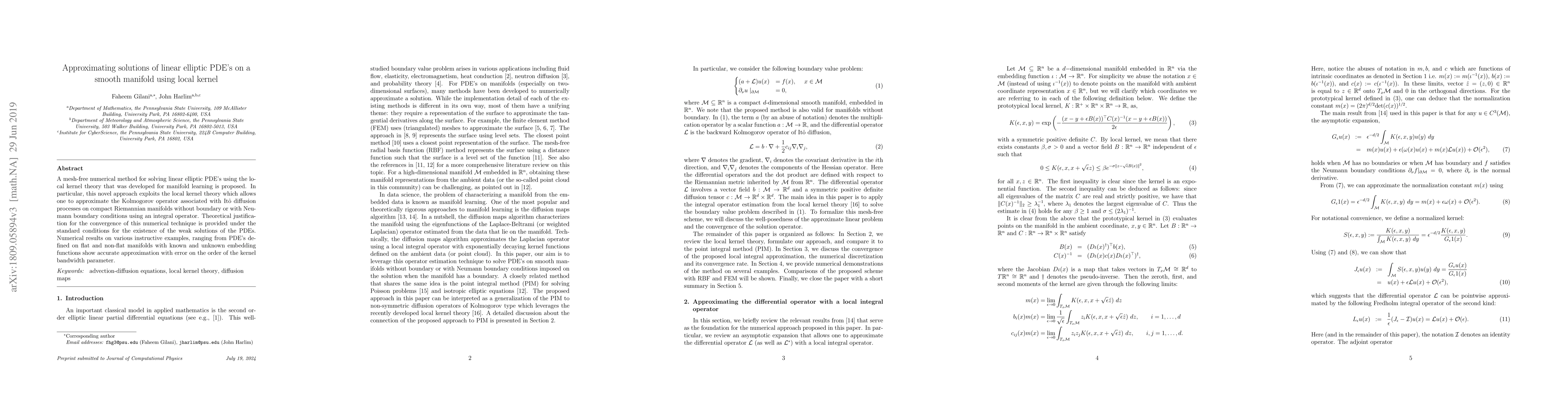A mesh-free numerical method for solving linear elliptic PDE's using the local kernel theory that was developed for manifold learning is proposed. In particular, this novel approach exploits the local kernel theory which allows one to approximate the Kolmogorov operator associated with It\^o processes on compact Riemannian manifolds without boundary or with Neumann boundary conditions using an integral operator. Theoretical justification for the convergence of this numerical technique is provided under the standard conditions for the existence of the weak solutions of the PDEs. Numerical results on various instructive examples, ranging from PDE's defined on flat and non-flat manifolds with known and unknown embedding functions show accurate approximation with error on the order of the kernel bandwidth parameter.