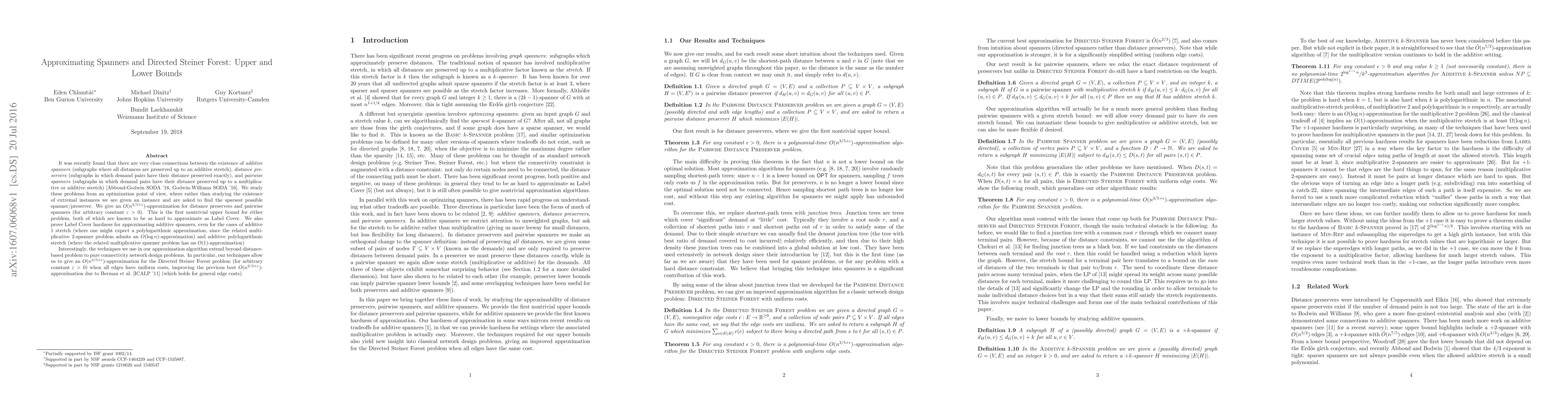 This paper presents the first nontrivial upper bounds for approximating additive spanners, distance preservers, and pairwise spanners, achieving an $O(n^{3/5 + \epsilon})$-approximation. It also proves Label Cover hardness for additive spanners and extends the approximation technique to improve the Directed Steiner Forest problem's approximation to $O(n^{3/5 + \epsilon})$.