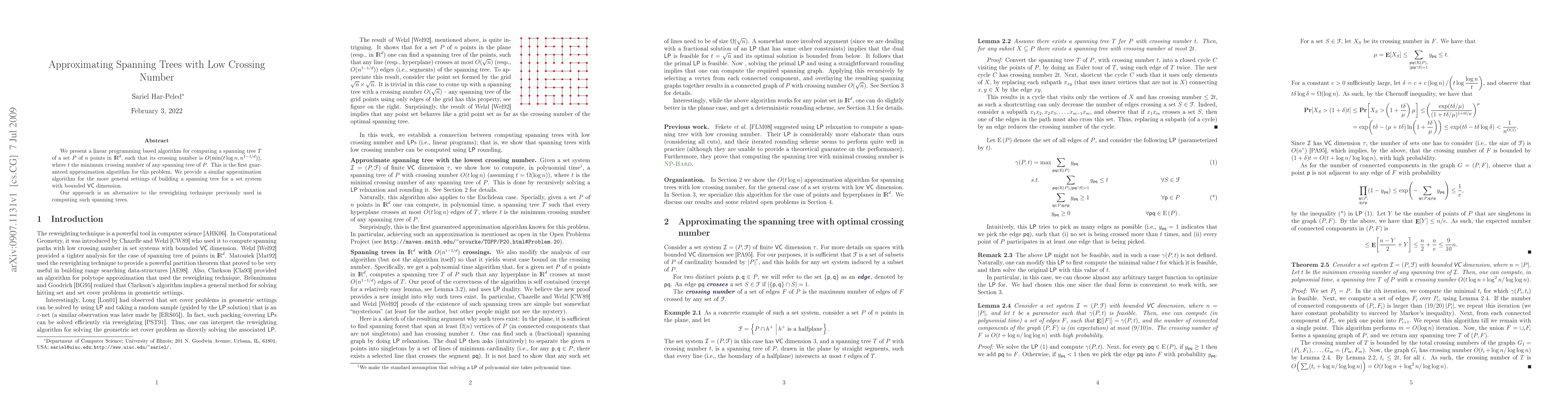 This paper introduces a linear programming-based algorithm for constructing a spanning tree with a low crossing number for a set of points in $\Re^d$, achieving an approximation of $O(\min(t \log n, n^{1-1/d}))$. It presents the first guaranteed approximation algorithm for this problem and extends the approach to spanning trees in set systems with bounded VC dimension, offering an alternative to the reweighting technique.