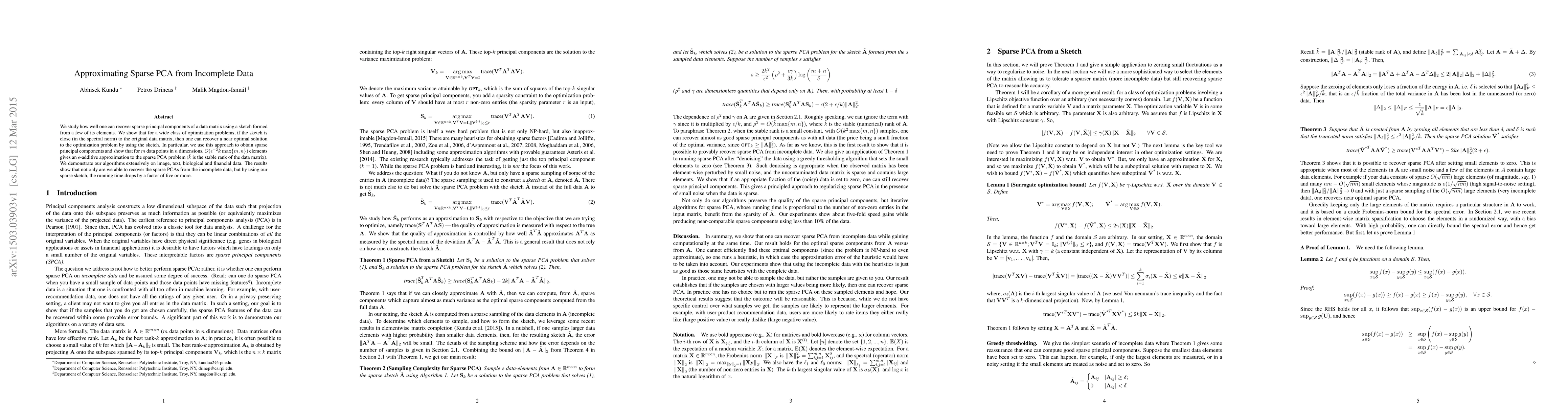 We study how well one can recover sparse principal components of a data matrix using a sketch formed from a few of its elements. We show that for a wide class of optimization problems, if the sketch is close (in the spectral norm) to the original data matrix, then one can recover a near optimal solution to the optimization problem by using the sketch. In particular, we use this approach to obtain sparse principal components and show that for \math{m} data points in \math{n} dimensions, \math{O(\epsilon^{-2}\tilde k\max\{m,n\})} elements gives an \math{\epsilon}-additive approximation to the sparse PCA problem (\math{\tilde k} is the stable rank of the data matrix). We demonstrate our algorithms extensively on image, text, biological and financial data. The results show that not only are we able to recover the sparse PCAs from the incomplete data, but by using our sparse sketch, the running time drops by a factor of five or more.