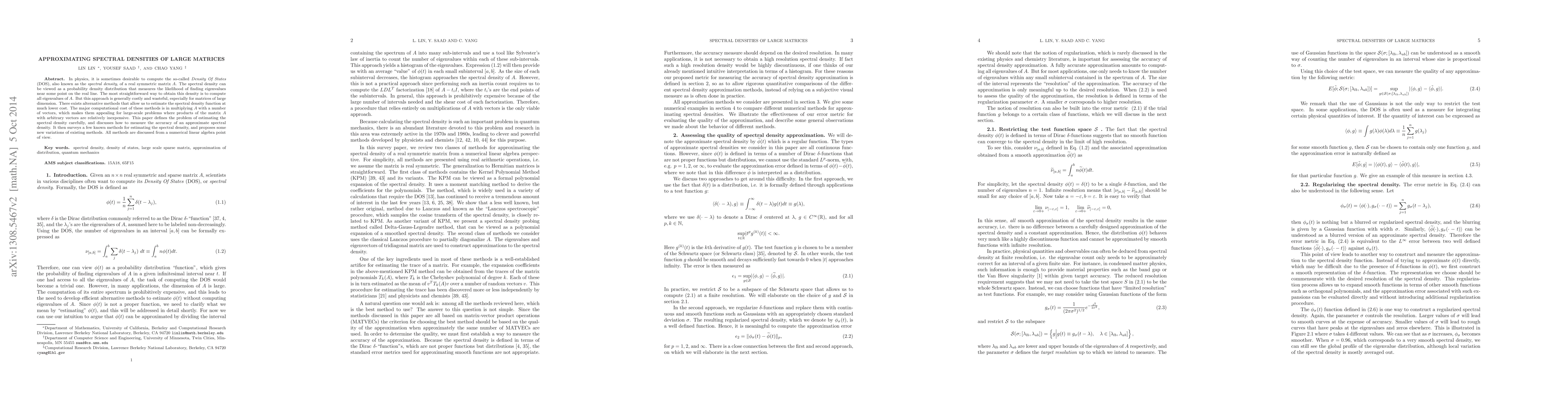 In physics, it is sometimes desirable to compute the so-called \emph{Density Of States} (DOS), also known as the \emph{spectral density}, of a real symmetric matrix $A$. The spectral density can be viewed as a probability density distribution that measures the likelihood of finding eigenvalues near some point on the real line. The most straightforward way to obtain this density is to compute all eigenvalues of $A$. But this approach is generally costly and wasteful, especially for matrices of large dimension. There exists alternative methods that allow us to estimate the spectral density function at much lower cost. The major computational cost of these methods is in multiplying $A$ with a number of vectors, which makes them appealing for large-scale problems where products of the matrix $A$ with arbitrary vectors are relatively inexpensive. This paper defines the problem of estimating the spectral density carefully, and discusses how to measure the accuracy of an approximate spectral density. It then surveys a few known methods for estimating the spectral density, and proposes some new variations of existing methods. All methods are discussed from a numerical linear algebra point of view.