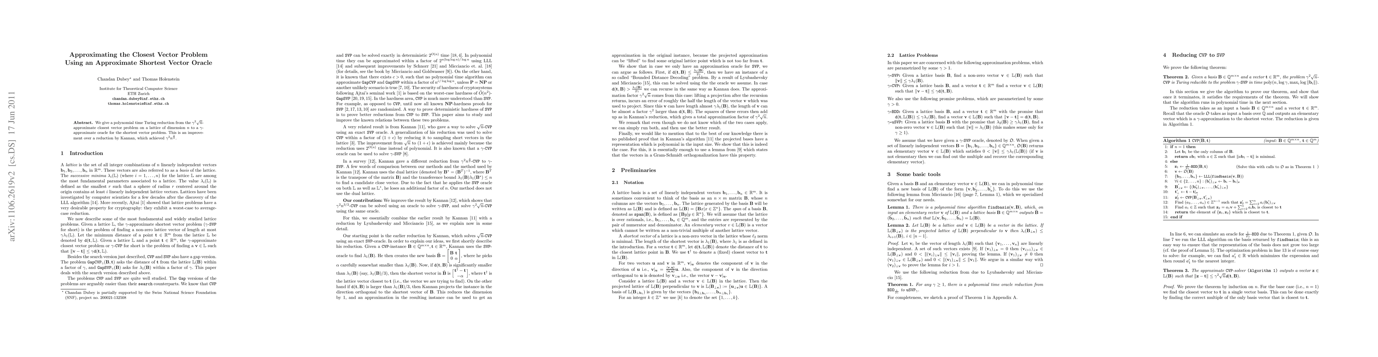 Summary: This paper presents a polynomial time Turing reduction that improves the approximation factor from the closest vector problem to the shortest vector problem in lattices, achieving a $\gamma^2\sqrt{n}$ approximation compared to Kannan's $\gamma^2n^{3/2}$ method.