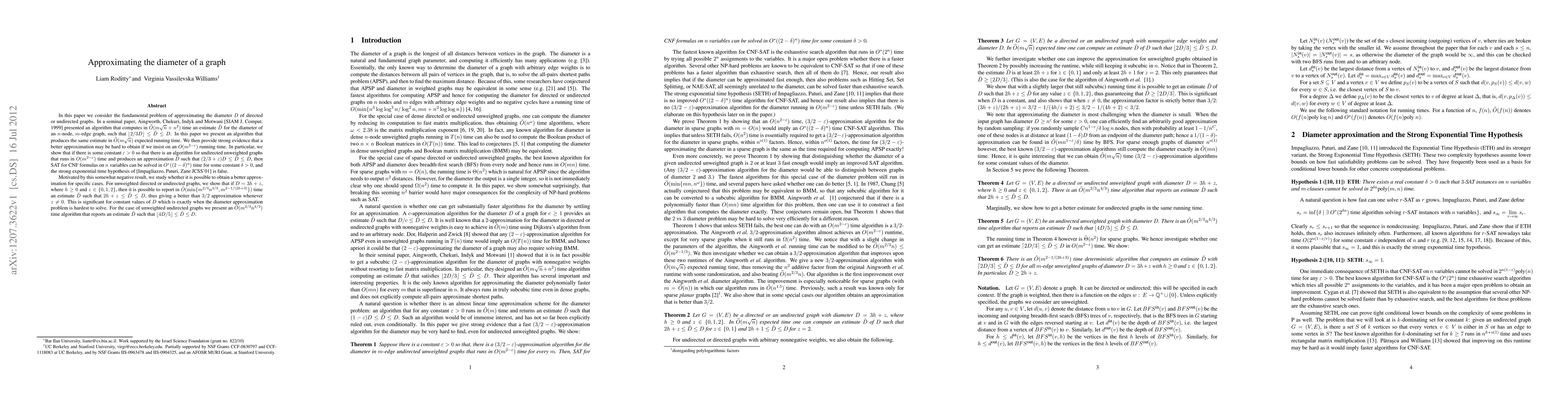 In this paper we consider the fundamental problem of approximating the diameter $D$ of directed or undirected graphs. In a seminal paper, Aingworth, Chekuri, Indyk and Motwani [SIAM J. Comput. 1999] presented an algorithm that computes in $\Ot(m\sqrt n + n^2)$ time an estimate $\hat{D}$ for the diameter of an $n$-node, $m$-edge graph, such that $\lfloor 2/3 D \rfloor \leq \hat{D} \leq D$. In this paper we present an algorithm that produces the same estimate in $\Ot(m\sqrt n)$ expected running time. We then provide strong evidence that a better approximation may be hard to obtain if we insist on an $O(m^{2-\eps})$ running time. In particular, we show that if there is some constant $\eps>0$ so that there is an algorithm for undirected unweighted graphs that runs in $O(m^{2-\eps})$ time and produces an approximation $\hat{D}$ such that $ (2/3+\eps) D \leq \hat{D} \leq D$, then SAT for CNF formulas on $n$ variables can be solved in $O^{*}((2-\delta)^{n})$ time for some constant $\delta>0$, and the strong exponential time hypothesis of [Impagliazzo, Paturi, Zane JCSS'01] is false. Motivated by this somewhat negative result, we study whether it is possible to obtain a better approximation for specific cases. For unweighted directed or undirected graphs, we show that if $D=3h+z$, where $h\geq 0$ and $z\in {0,1,2}$, then it is possible to report in $\tilde{O}(\min{m^{2/3} n^{4/3},m^{2-1/(2h+3)}})$ time an estimate $\hat{D}$ such that $2h+z \leq \hat{D}\leq D$, thus giving a better than 3/2 approximation whenever $z\neq 0$. This is significant for constant values of $D$ which is exactly when the diameter approximation problem is hardest to solve. For the case of unweighted undirected graphs we present an $\tilde{O}(m^{2/3} n^{4/3})$ time algorithm that reports an estimate $\hat{D}$ such that $\lfloor 4D/5\rfloor \leq \hat{D}\leq D$.
