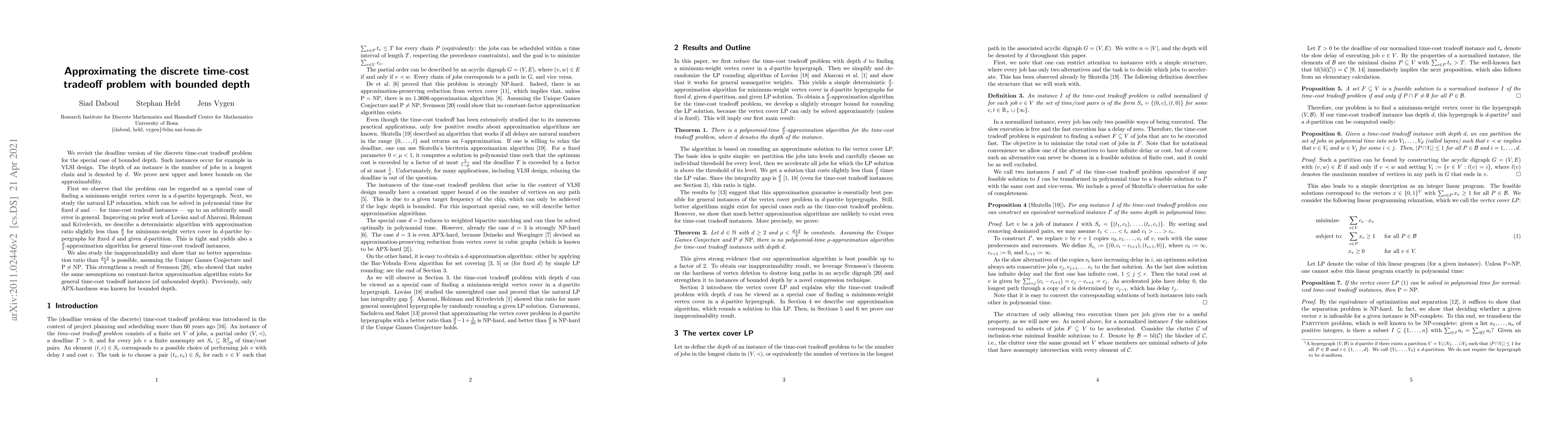 We revisit the deadline version of the discrete time-cost tradeoff problem for the special case of bounded depth. Such instances occur for example in VLSI design. The depth of an instance is the number of jobs in a longest chain and is denoted by $d$. We prove new upper and lower bounds on the approximability. First we observe that the problem can be regarded as a special case of finding a minimum-weight vertex cover in a $d$-partite hypergraph. Next, we study the natural LP relaxation, which can be solved in polynomial time for fixed $d$ and -- for time-cost tradeoff instances -- up to an arbitrarily small error in general. Improving on prior work of Lov\'asz and of Aharoni, Holzman and Krivelevich, we describe a deterministic algorithm with approximation ratio slightly less than $\frac{d}{2}$ for minimum-weight vertex cover in $d$-partite hypergraphs for fixed $d$ and given $d$-partition. This is tight and yields also a $\frac{d}{2}$-approximation algorithm for general time-cost tradeoff instances. We also study the inapproximability and show that no better approximation ratio than $\frac{d+2}{4}$ is possible, assuming the Unique Games Conjecture and $\text{P}\neq\text{NP}$. This strengthens a result of Svensson, who showed that under the same assumptions no constant-factor approximation algorithm exists for general time-cost tradeoff instances (of unbounded depth). Previously, only APX-hardness was known for bounded depth.
