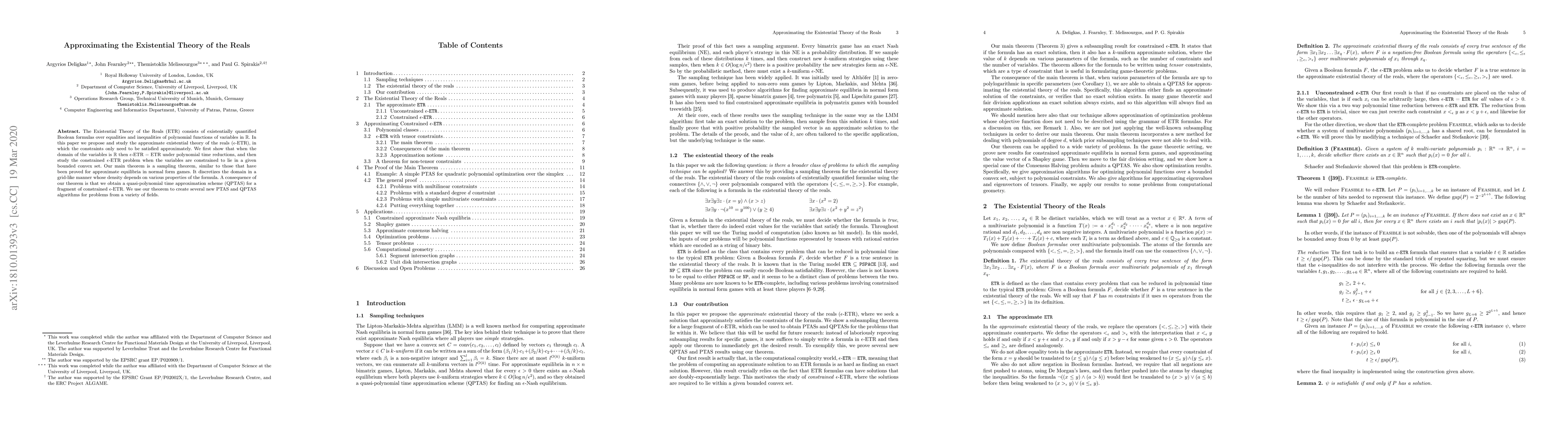 The paper introduces the concept of approximate existential theory of the reals (ε-ETR) and presents a sampling theorem that leads to a QPTAS for constrained ε-ETR problems, along with new approximation algorithms for various fields