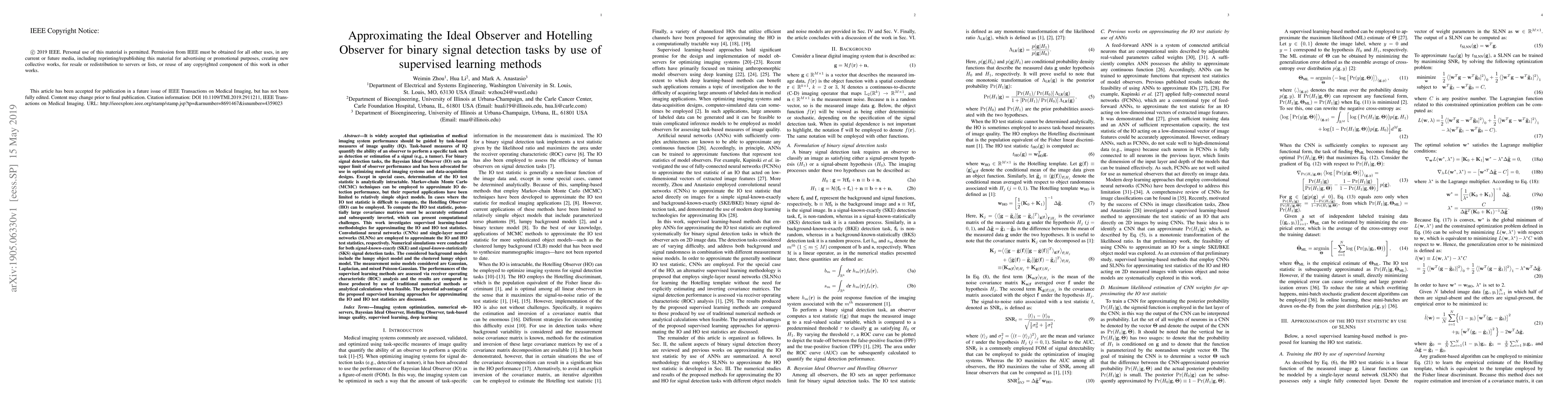 It is widely accepted that optimization of medical imaging system performance should be guided by task-based measures of image quality (IQ). Task-based measures of IQ quantify the ability of an observer to perform a specific task such as detection or estimation of a signal (e.g., a tumor). For binary signal detection tasks, the Bayesian Ideal Observer (IO) sets an upper limit of observer performance and has been advocated for use in optimizing medical imaging systems and data-acquisition designs. Except in special cases, determination of the IO test statistic is analytically intractable. Markov-chain Monte Carlo (MCMC) techniques can be employed to approximate IO detection performance, but their reported applications have been limited to relatively simple object models. In cases where the IO test statistic is difficult to compute, the Hotelling Observer (HO) can be employed. To compute the HO test statistic, potentially large covariance matrices must be accurately estimated and subsequently inverted, which can present computational challenges. This work investigates supervised learning-based methodologies for approximating the IO and HO test statistics. Convolutional neural networks (CNNs) and single-layer neural networks (SLNNs) are employed to approximate the IO and HO test statistics, respectively. Numerical simulations were conducted for both signal-known-exactly (SKE) and signal-known-statistically (SKS) signal detection tasks. The performances of the supervised learning methods are assessed via receiver operating characteristic (ROC) analysis and the results are compared to those produced by use of traditional numerical methods or analytical calculations when feasible. The potential advantages of the proposed supervised learning approaches for approximating the IO and HO test statistics are discussed.