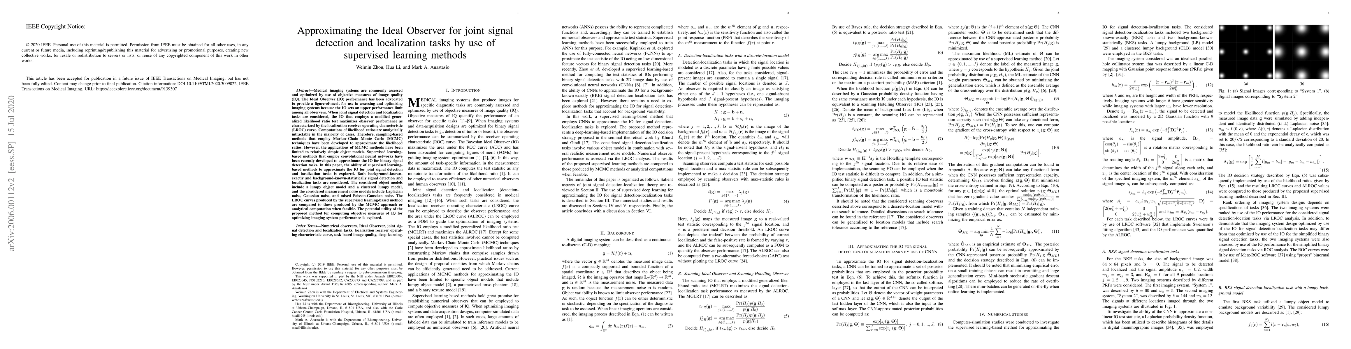 Medical imaging systems are commonly assessed and optimized by use of objective measures of image quality (IQ). The Ideal Observer (IO) performance has been advocated to provide a figure-of-merit for use in assessing and optimizing imaging systems because the IO sets an upper performance limit among all observers. When joint signal detection and localization tasks are considered, the IO that employs a modified generalized likelihood ratio test maximizes observer performance as characterized by the localization receiver operating characteristic (LROC) curve. Computations of likelihood ratios are analytically intractable in the majority of cases. Therefore, sampling-based methods that employ Markov-Chain Monte Carlo (MCMC) techniques have been developed to approximate the likelihood ratios. However, the applications of MCMC methods have been limited to relatively simple object models. Supervised learning-based methods that employ convolutional neural networks have been recently developed to approximate the IO for binary signal detection tasks. In this paper, the ability of supervised learning-based methods to approximate the IO for joint signal detection and localization tasks is explored. Both background-known-exactly and background-known-statistically signal detection and localization tasks are considered. The considered object models include a lumpy object model and a clustered lumpy model, and the considered measurement noise models include Laplacian noise, Gaussian noise, and mixed Poisson-Gaussian noise. The LROC curves produced by the supervised learning-based method are compared to those produced by the MCMC approach or analytical computation when feasible. The potential utility of the proposed method for computing objective measures of IQ for optimizing imaging system performance is explored.