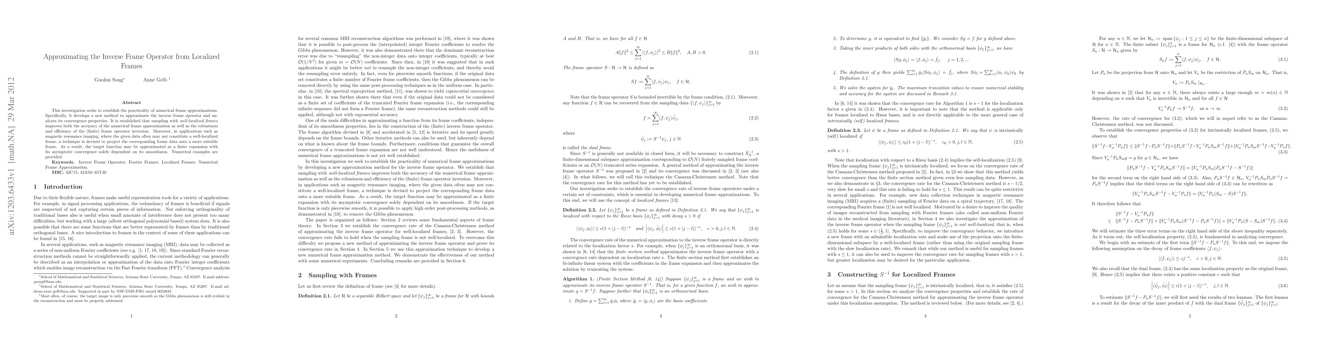 This investigation seeks to establish the practicality of numerical frame approximations. Specifically, it develops a new method to approximate the inverse frame operator and analyzes its convergence properties. It is established that sampling with {\em well-localized frames} improves both the accuracy of the numerical frame approximation as well as the robustness and efficiency of the (finite) frame operator inversion. Moreover, in applications such as magnetic resonance imaging, where the given data often may not constitute a well-localized frame, a technique is devised to project the corresponding frame data onto a more suitable frame. As a result, the target function may be approximated as a finite expansion with its asymptotic convergence solely dependent on its smoothness. Numerical examples are provided.
