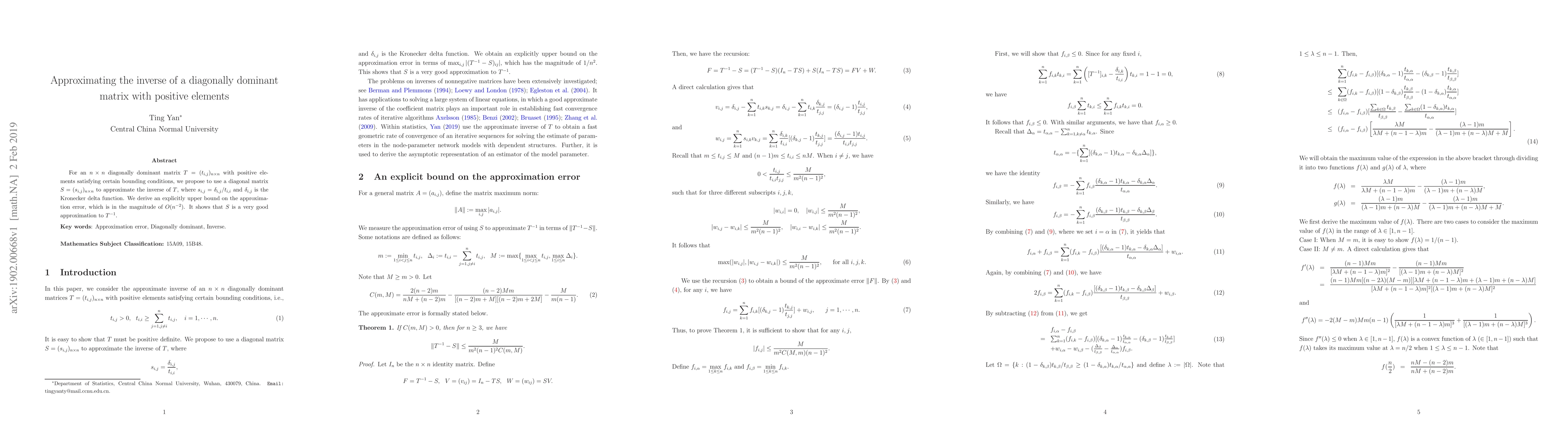 This paper proposes using a diagonal matrix $S$ to approximate the inverse of a diagonally dominant matrix $T$ with positive elements, showing that $S$ provides an approximation error of $O(n^{-2})$. The diagonal elements of $S$ are derived from $T$'s diagonal elements, demonstrating $S$ as a very good approximation.