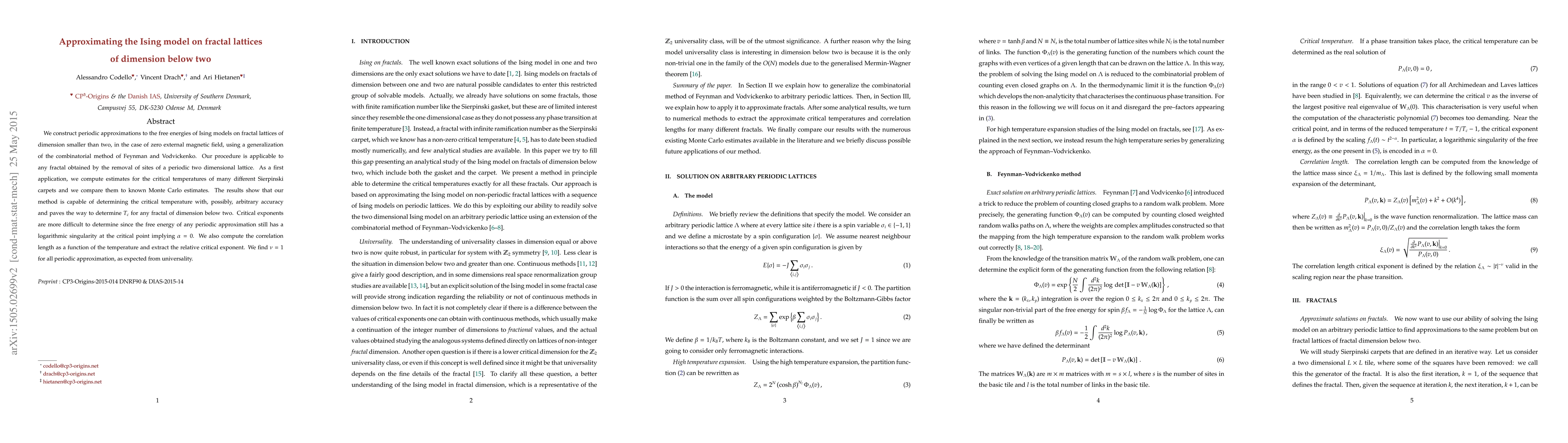 We construct periodic approximations to the free energies of Ising models on fractal lattices of dimension smaller than two, in the case of zero external magnetic field, using a generalization of the combinatorial method of Feynman and Vodvickenko. Our procedure is applicable to any fractal obtained by the removal of sites of a periodic two dimensional lattice. As a first application, we compute estimates for the critical temperatures of many different Sierpinski carpets and we compare them to known Monte Carlo estimates. The results show that our method is capable of determining the critical temperature with, possibly, arbitrary accuracy and paves the way to determine $T_c$ for any fractal of dimension below two. Critical exponents are more difficult to determine since the free energy of any periodic approximation still has a logarithmic singularity at the critical point implying $\alpha = 0$. We also compute the correlation length as a function of the temperature and extract the relative critical exponent. We find $\nu=1$ for all periodic approximation, as expected from universality.