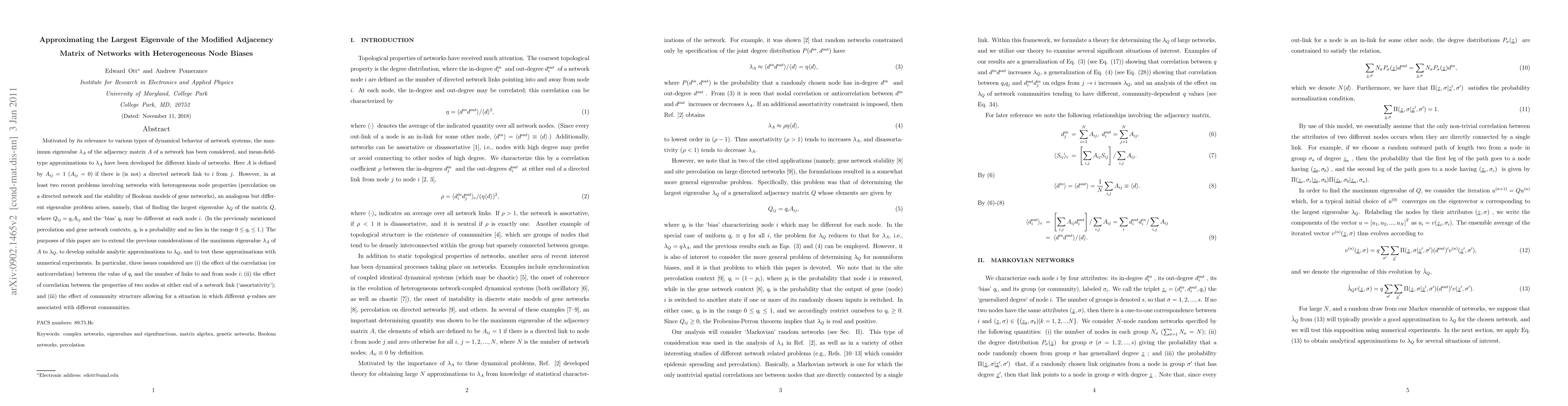 This paper develops analytic approximations for the largest eigenvalue $\lambda_Q$ of the modified adjacency matrix $Q$ in networks with heterogeneous node biases, testing these approximations through numerical experiments. It examines the effects of node link correlations, assortativity, and community structures on $\lambda_Q$.