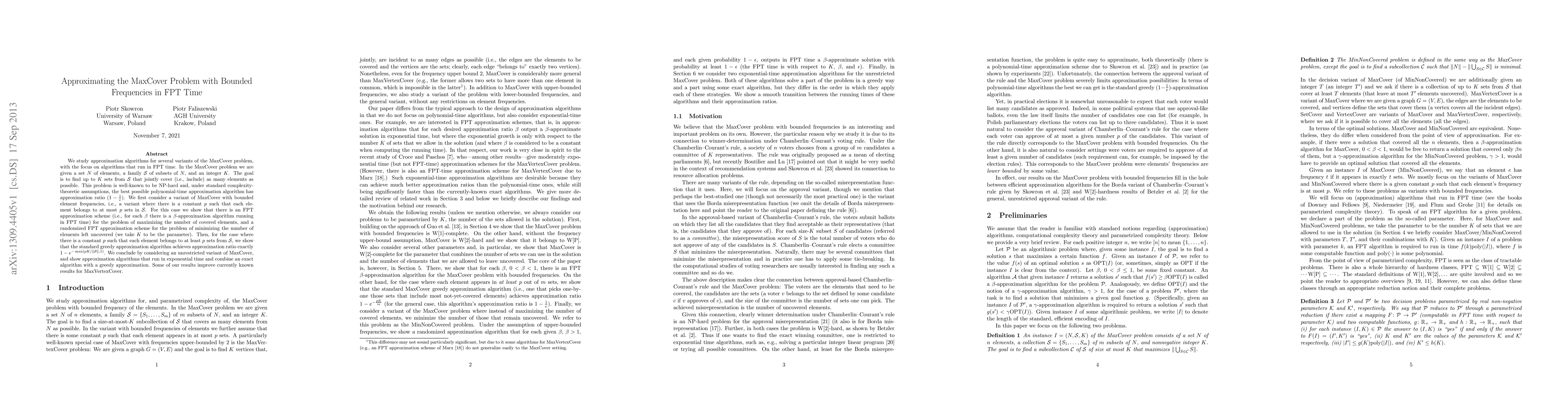 We study approximation algorithms for several variants of the MaxCover problem, with the focus on algorithms that run in FPT time. In the MaxCover problem we are given a set N of elements, a family S of subsets of N, and an integer K. The goal is to find up to K sets from S that jointly cover (i.e., include) as many elements as possible. This problem is well-known to be NP-hard and, under standard complexity-theoretic assumptions, the best possible polynomial-time approximation algorithm has approximation ratio (1 - 1/e). We first consider a variant of MaxCover with bounded element frequencies, i.e., a variant where there is a constant p such that each element belongs to at most p sets in S. For this case we show that there is an FPT approximation scheme (i.e., for each B there is a B-approximation algorithm running in FPT time) for the problem of maximizing the number of covered elements, and a randomized FPT approximation scheme for the problem of minimizing the number of elements left uncovered (we take K to be the parameter). Then, for the case where there is a constant p such that each element belongs to at least p sets from S, we show that the standard greedy approximation algorithm achieves approximation ratio exactly (1-e^{-max(pK/|S|, 1)}). We conclude by considering an unrestricted variant of MaxCover, and show approximation algorithms that run in exponential time and combine an exact algorithm with a greedy approximation. Some of our results improve currently known results for MaxVertexCover.