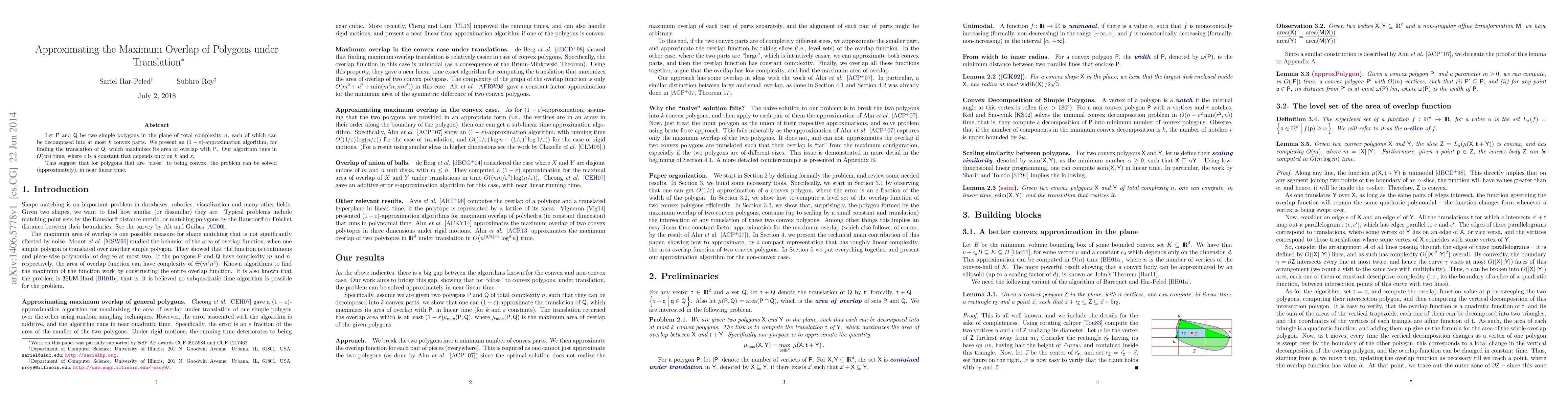 Let $P$ and $Q$ be two simple polygons in the plane of total complexity $n$, each of which can be decomposed into at most $k$ convex parts. We present an $(1-\varepsilon)$-approximation algorithm, for finding the translation of $Q$, which maximizes its area of overlap with $P$. Our algorithm runs in $O(c n)$ time, where $c$ is a constant that depends only on $k$ and $\varepsilon$. This suggest that for polygons that are "close" to being convex, the problem can be solved (approximately), in near linear time.