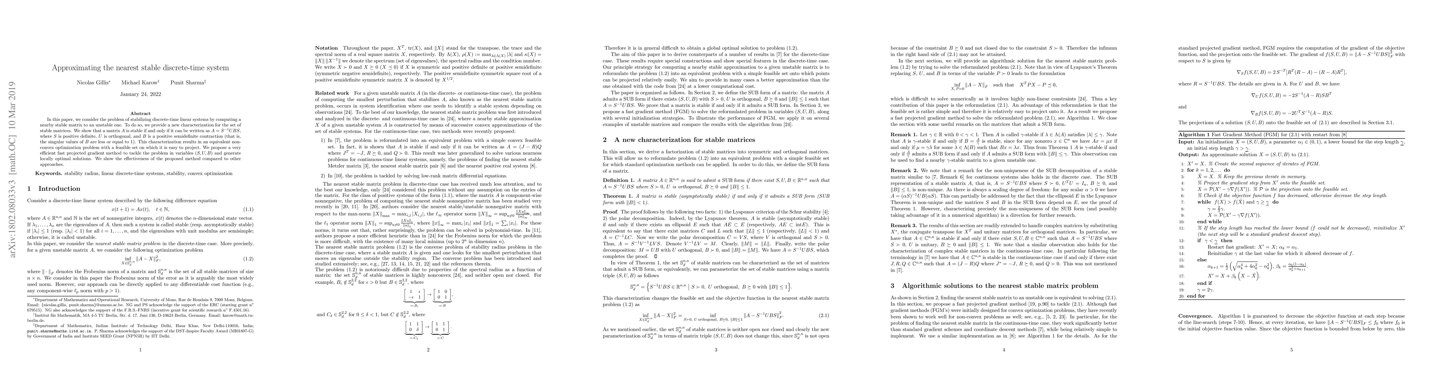 Researchers develop a new method to stabilize unstable discrete-time systems by approximating nearby stable matrices, providing an efficient solution through a projected gradient approach.