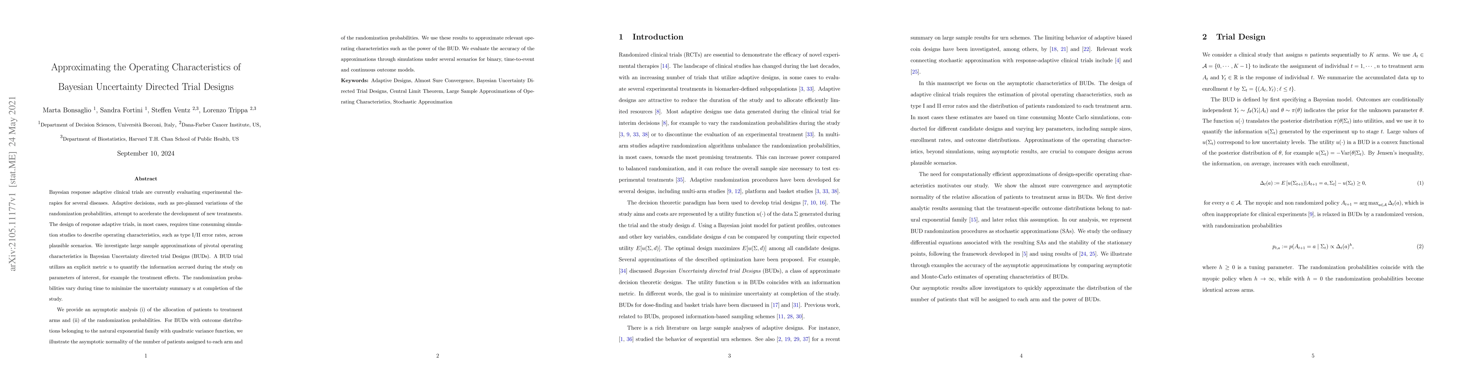 Bayesian response adaptive clinical trials are currently evaluating experimental therapies for several diseases. Adaptive decisions, such as pre-planned variations of the randomization probabilities, attempt to accelerate the development of new treatments. The design of response adaptive trials, in most cases, requires time consuming simulation studies to describe operating characteristics, such as type I/II error rates, across plausible scenarios. We investigate large sample approximations of pivotal operating characteristics in Bayesian Uncertainty directed trial Designs (BUDs). A BUD trial utilizes an explicit metric u to quantify the information accrued during the study on parameters of interest, for example the treatment effects. The randomization probabilities vary during time to minimize the uncertainty summary u at completion of the study. We provide an asymptotic analysis (i) of the allocation of patients to treatment arms and (ii) of the randomization probabilities. For BUDs with outcome distributions belonging to the natural exponential family with quadratic variance function, we illustrate the asymptotic normality of the number of patients assigned to each arm and of the randomization probabilities. We use these results to approximate relevant operating characteristics such as the power of the BUD. We evaluate the accuracy of the approximations through simulations under several scenarios for binary, time-to-event and continuous outcome models.