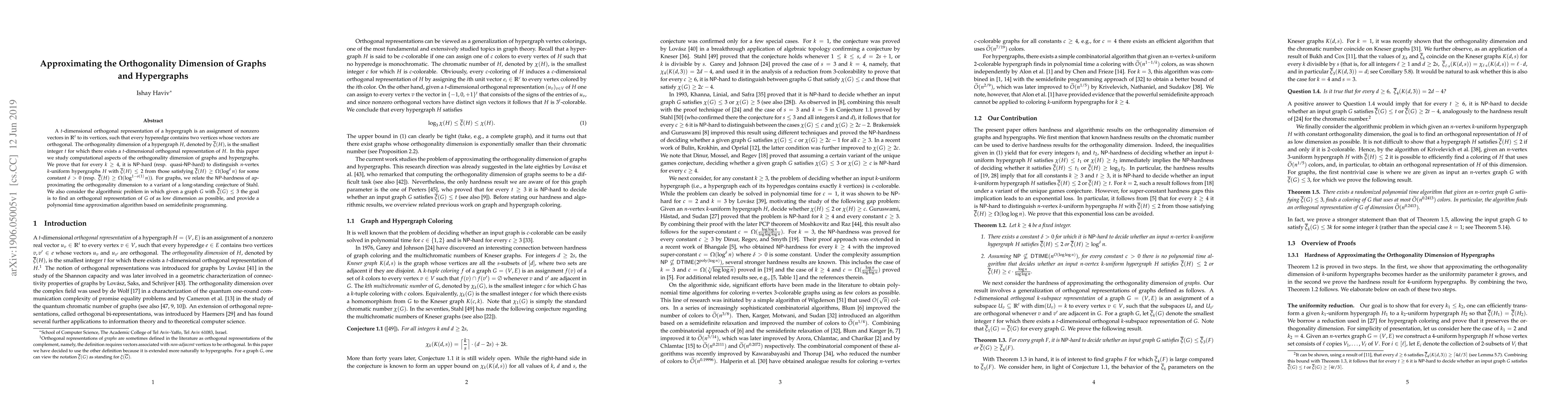 This paper investigates the computational complexity of determining the orthogonality dimension of graphs and hypergraphs, proving $\mathsf{NP}$-hardness for distinguishing hypergraphs with low versus high orthogonality dimensions. It also presents a polynomial time approximation algorithm for finding low-dimensional orthogonal representations in graphs with small orthogonality dimension.