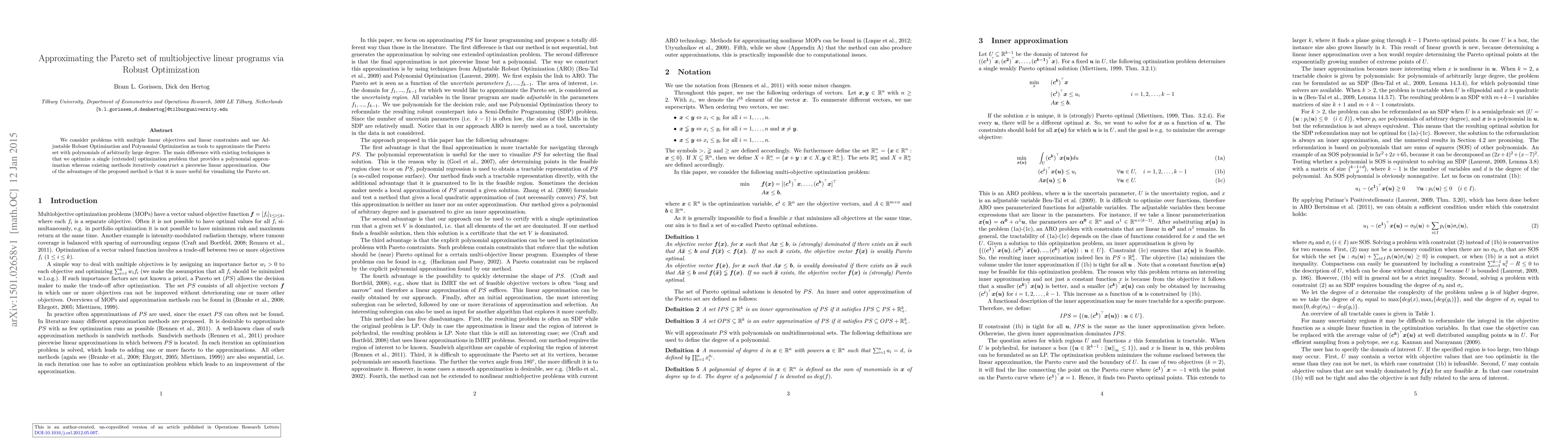 We consider problems with multiple linear objectives and linear constraints and use Adjustable Robust Optimization and Polynomial Optimization as tools to approximate the Pareto set with polynomials of arbitrarily large degree. The main difference with existing techniques is that we optimize a single (extended) optimization problem that provides a polynomial approximation whereas existing methods iteratively construct a piecewise linear approximation. One of the advantages of the proposed method is that it is more useful for visualizing the Pareto set.