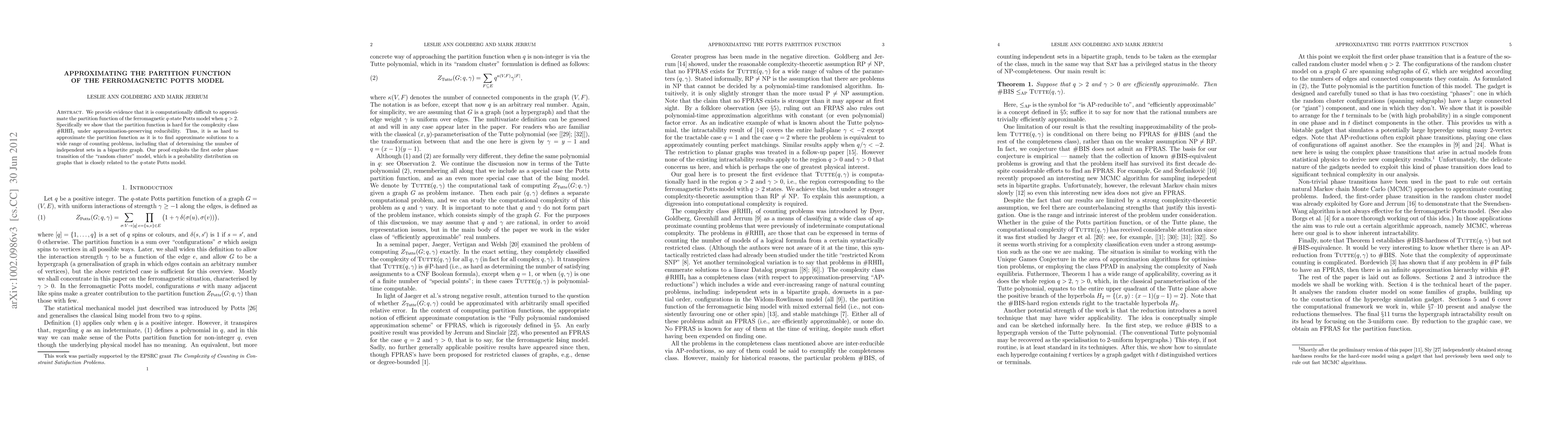 This paper demonstrates that approximating the partition function of the ferromagnetic Potts model for q>2 is computationally difficult, placing it in the complexity class #RHPi_1. The proof leverages the first-order phase transition of the related "random cluster" model to establish this hardness.