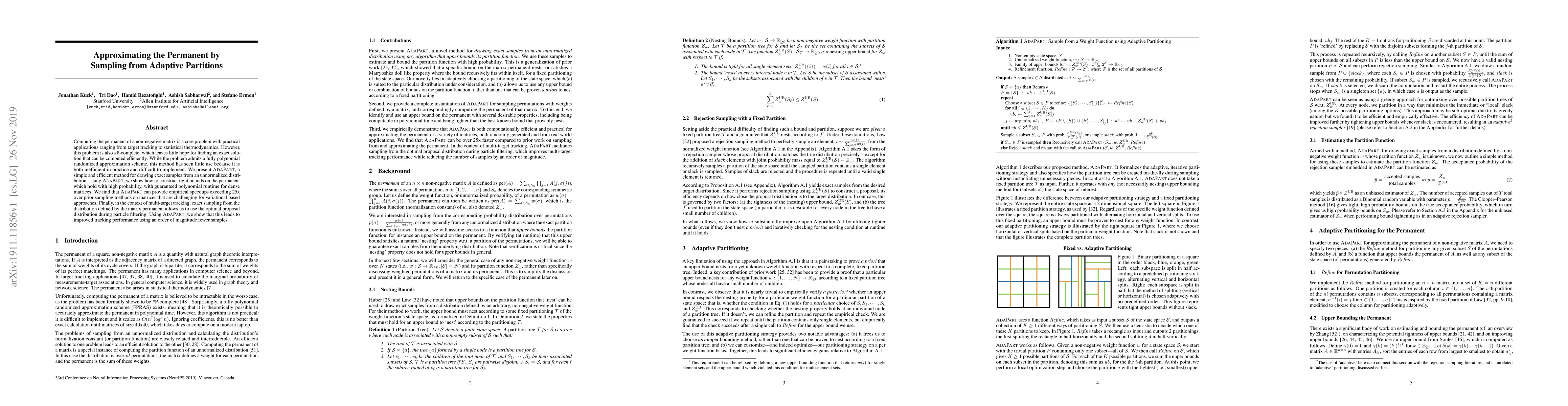 Computing the permanent of a non-negative matrix is a core problem with practical applications ranging from target tracking to statistical thermodynamics. However, this problem is also #P-complete, which leaves little hope for finding an exact solution that can be computed efficiently. While the problem admits a fully polynomial randomized approximation scheme, this method has seen little use because it is both inefficient in practice and difficult to implement. We present AdaPart, a simple and efficient method for drawing exact samples from an unnormalized distribution. Using AdaPart, we show how to construct tight bounds on the permanent which hold with high probability, with guaranteed polynomial runtime for dense matrices. We find that AdaPart can provide empirical speedups exceeding 25x over prior sampling methods on matrices that are challenging for variational based approaches. Finally, in the context of multi-target tracking, exact sampling from the distribution defined by the matrix permanent allows us to use the optimal proposal distribution during particle filtering. Using AdaPart, we show that this leads to improved tracking performance using an order of magnitude fewer samples.
