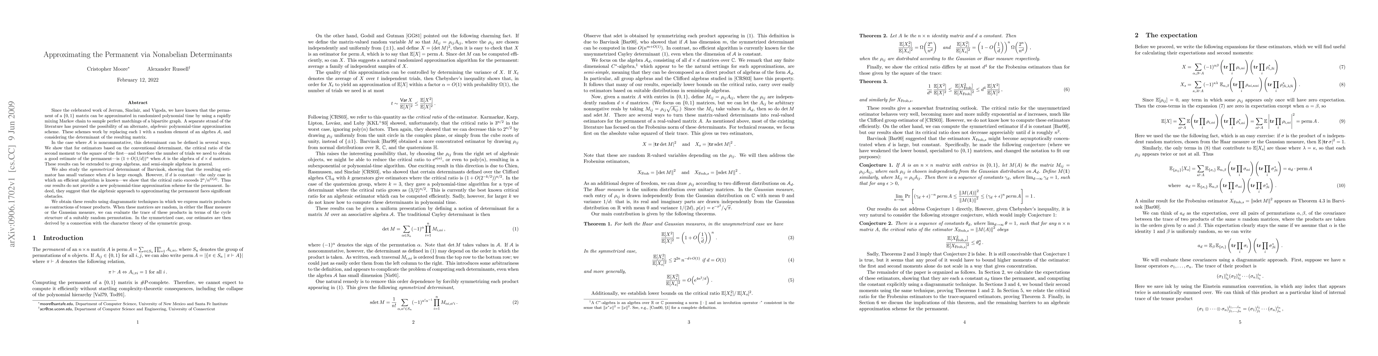 This paper explores the approximation of the permanent of a {0,1} matrix using nonabelian determinants, particularly focusing on group and semi-simple algebras. It finds that while certain algebraic methods show promise, they face significant obstacles, especially for constant dimensions, and do not yield a new polynomial-time approximation scheme. The study uses diagrammatic techniques and character theory to derive these results.