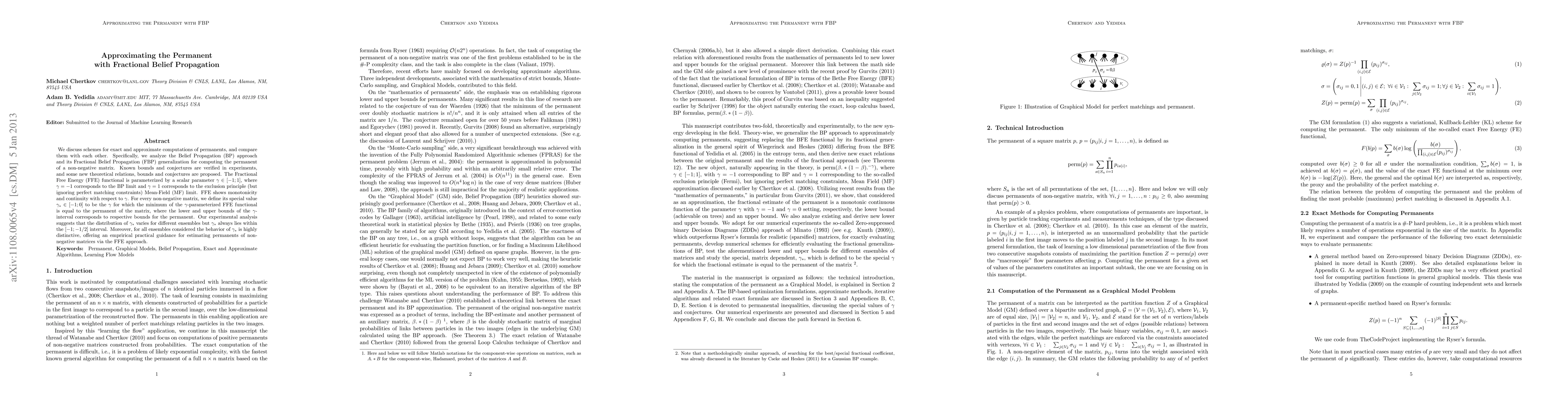 We discuss schemes for exact and approximate computations of permanents, and compare them with each other. Specifically, we analyze the Belief Propagation (BP) approach and its Fractional Belief Propagation (FBP) generalization for computing the permanent of a non-negative matrix. Known bounds and conjectures are verified in experiments, and some new theoretical relations, bounds and conjectures are proposed. The Fractional Free Energy (FFE) functional is parameterized by a scalar parameter $\gamma\in[-1;1]$, where $\gamma=-1$ corresponds to the BP limit and $\gamma=1$ corresponds to the exclusion principle (but ignoring perfect matching constraints) Mean-Field (MF) limit. FFE shows monotonicity and continuity with respect to $\gamma$. For every non-negative matrix, we define its special value $\gamma_*\in[-1;0]$ to be the $\gamma$ for which the minimum of the $\gamma$-parameterized FFE functional is equal to the permanent of the matrix, where the lower and upper bounds of the $\gamma$-interval corresponds to respective bounds for the permanent. Our experimental analysis suggests that the distribution of $\gamma_*$ varies for different ensembles but $\gamma_*$ always lies within the $[-1;-1/2]$ interval. Moreover, for all ensembles considered the behavior of $\gamma_*$ is highly distinctive, offering an emprirical practical guidance for estimating permanents of non-negative matrices via the FFE approach.