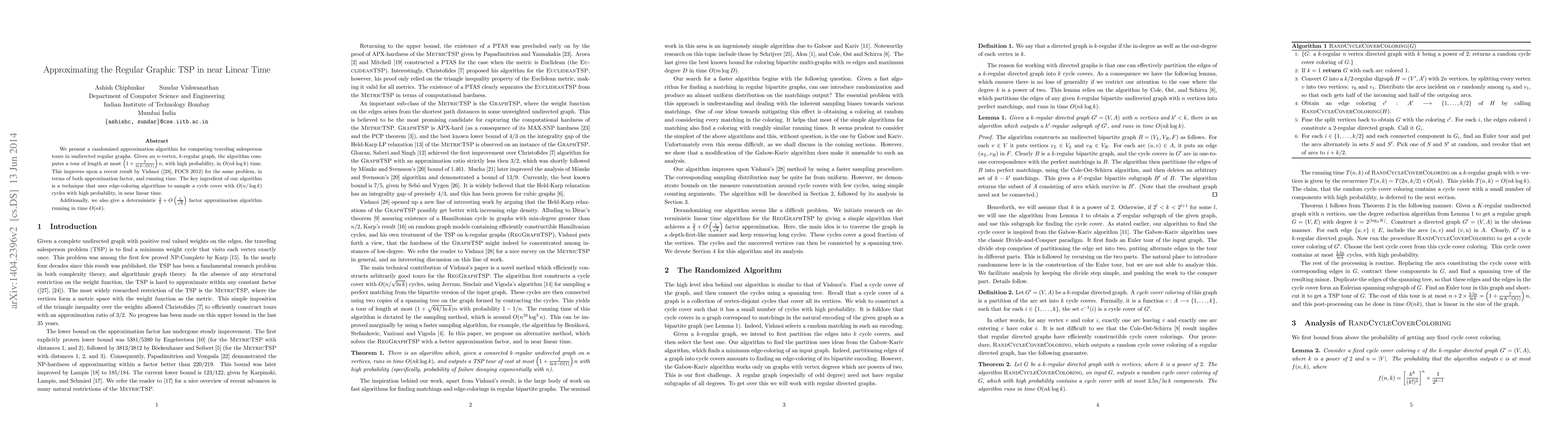 We present a randomized approximation algorithm for computing traveling salesperson tours in undirected regular graphs. Given an $n$-vertex, $k$-regular graph, the algorithm computes a tour of length at most $\left(1+\frac{7}{\ln k-O(1)}\right)n$, with high probability, in $O(nk \log k)$ time. This improves upon a recent result by Vishnoi (\cite{Vishnoi12}, FOCS 2012) for the same problem, in terms of both approximation factor, and running time. The key ingredient of our algorithm is a technique that uses edge-coloring algorithms to sample a cycle cover with $O(n/\log k)$ cycles with high probability, in near linear time. Additionally, we also give a deterministic $\frac{3}{2}+O\left(\frac{1}{\sqrt{k}}\right)$ factor approximation algorithm running in time $O(nk)$.
