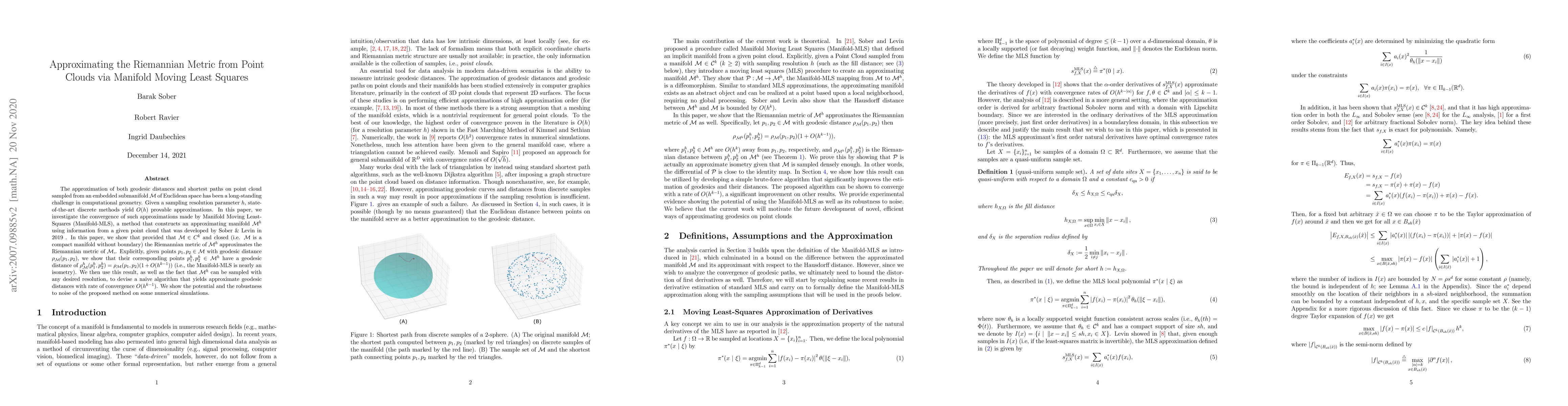 The approximation of both geodesic distances and shortest paths on point cloud sampled from an embedded submanifold $\mathcal{M}$ of Euclidean space has been a long-standing challenge in computational geometry. Given a sampling resolution parameter $ h $, state-of-the-art discrete methods yield $ O(h) $ provable approximations. In this paper, we investigate the convergence of such approximations made by Manifold Moving Least-Squares (Manifold-MLS), a method that constructs an approximating manifold $\mathcal{M}^h$ using information from a given point cloud that was developed by Sober \& Levin in 2019. In this paper, we show that provided that $\mathcal{M}\in C^{k}$ and closed (i.e. $\mathcal{M}$ is a compact manifold without boundary) the Riemannian metric of $ \mathcal{M}^h $ approximates the Riemannian metric of $ \mathcal{M}, $. Explicitly, given points $ p_1, p_2 \in \mathcal{M}$ with geodesic distance $ \rho_{\mathcal{M}}(p_1, p_2) $, we show that their corresponding points $ p_1^h, p_2^h \in \mathcal{M}^h$ have a geodesic distance of $ \rho_{\mathcal{M}^h}(p_1^h,p_2^h) = \rho_{\mathcal{M}}(p_1, p_2)(1 + O(h^{k-1})) $ (i.e., the Manifold-MLS is nearly an isometry). We then use this result, as well as the fact that $ \mathcal{M}^h $ can be sampled with any desired resolution, to devise a naive algorithm that yields approximate geodesic distances with a rate of convergence $ O(h^{k-1}) $. We show the potential and the robustness to noise of the proposed method on some numerical simulations.