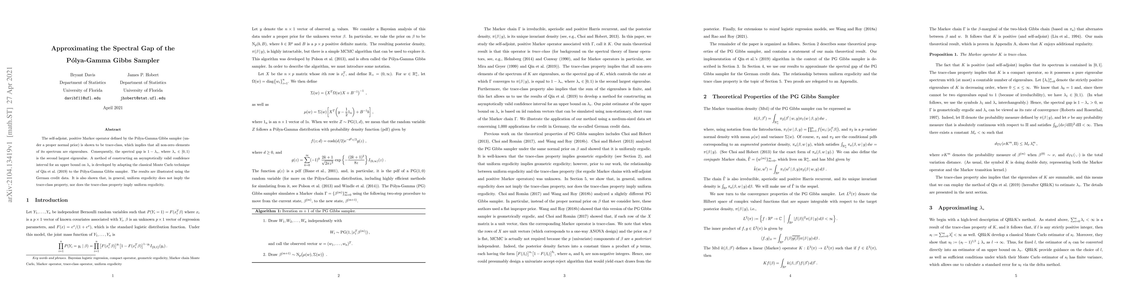 This paper demonstrates the trace-class property of the Pólya-Gamma Gibbs sampler's Markov operator, revealing that its spectral gap is $1-\lambda_*$, where $\lambda_*$ is the second largest eigenvalue. It introduces a method to construct an asymptotically valid confidence interval for $\lambda_*$ using adapted Monte Carlo techniques.