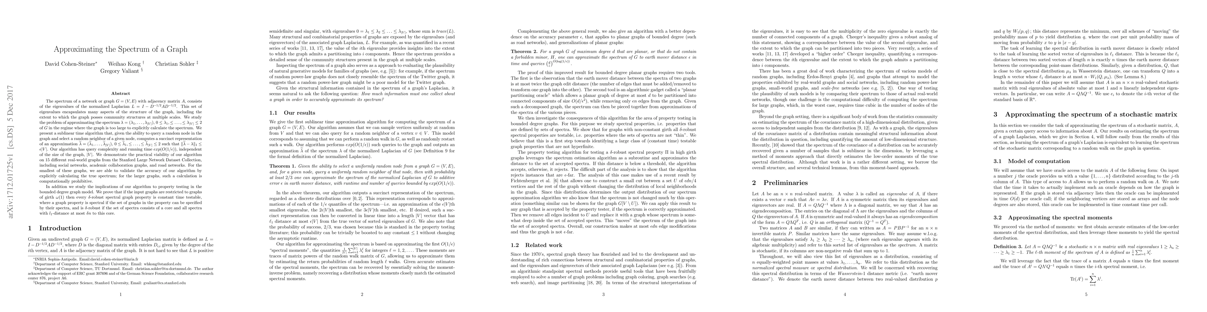 The spectrum of a network or graph $G=(V,E)$ with adjacency matrix $A$, consists of the eigenvalues of the normalized Laplacian $L= I - D^{-1/2} A D^{-1/2}$. This set of eigenvalues encapsulates many aspects of the structure of the graph, including the extent to which the graph posses community structures at multiple scales. We study the problem of approximating the spectrum $\lambda = (\lambda_1,\dots,\lambda_{|V|})$, $0 \le \lambda_1,\le \dots, \le \lambda_{|V|}\le 2$ of $G$ in the regime where the graph is too large to explicitly calculate the spectrum. We present a sublinear time algorithm that, given the ability to query a random node in the graph and select a random neighbor of a given node, computes a succinct representation of an approximation $\widetilde \lambda = (\widetilde \lambda_1,\dots,\widetilde \lambda_{|V|})$, $0 \le \widetilde \lambda_1,\le \dots, \le \widetilde \lambda_{|V|}\le 2$ such that $\|\widetilde \lambda - \lambda\|_1 \le \epsilon |V|$. Our algorithm has query complexity and running time $exp(O(1/\epsilon))$, independent of the size of the graph, $|V|$. We demonstrate the practical viability of our algorithm on 15 different real-world graphs from the Stanford Large Network Dataset Collection, including social networks, academic collaboration graphs, and road networks. For the smallest of these graphs, we are able to validate the accuracy of our algorithm by explicitly calculating the true spectrum; for the larger graphs, such a calculation is computationally prohibitive. In addition we study the implications of our algorithm to property testing in the bounded degree graph model.
